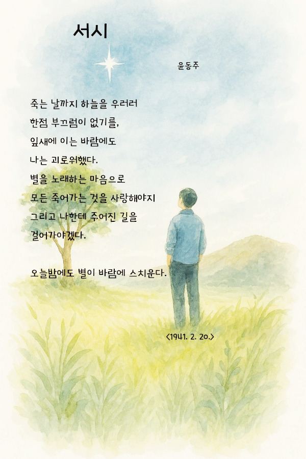 제국주의에 영혼을 잃어 ‘우러러’ 볼 하늘이 없었던 시대와 21세기 자본에 영혼을 잃어 ‘우러러’ 볼 하늘이 없는 시대가 만났다. 여기에 코로나 바이러스를 지나 계엄까지. 그 영혼들이 ‘바람’에 스치나 ‘우러러’ 봐야만 볼 수 있는 하늘에 ‘별’이 되어 있다. 이 역설을 시인은 알고 있었을 것이다. 그렇게 현실이 바람에 스쳐야 단단해지는 법이니까!