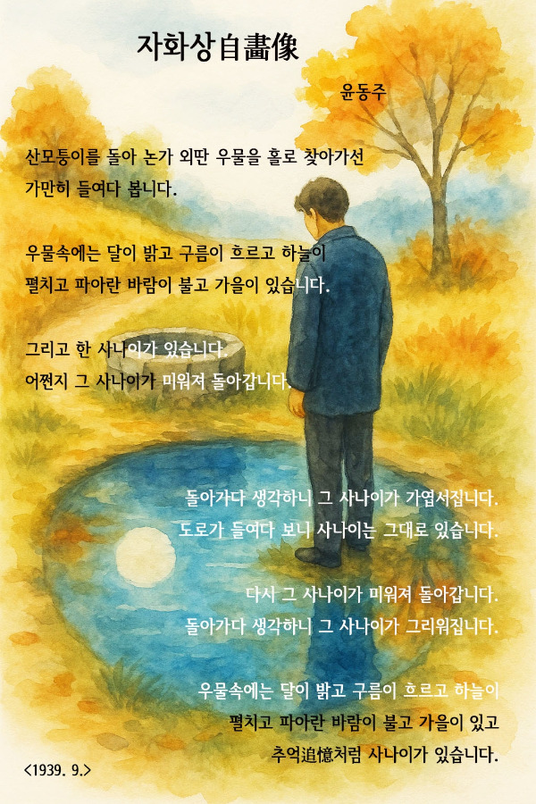 우리는 수없이 거울을 보지만, 자기 눈동자에 비친 자신의 상을 주의 깊게 들여다보지는 않는다. 시인은 우물을 거울처럼 사용했다. 그리고 ‘달’, ‘구름’, ‘하늘’, ‘파아란 바람’, ‘가을’을 본 후에 자신을 봤다. 주변을 먼저 들여다보고 인식해야 자신을 볼 수 있는 것처럼 시인은 <자화상>을 입체로 그려놓았다. 평면에 글자들을 눌러쓰고 입체파 그림처럼 전체를 보여준다.