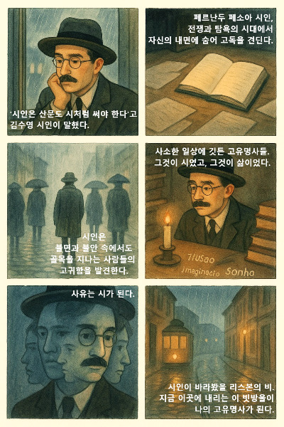 전쟁과 탐욕, 생명 파괴의 세상에서 시인은 무엇을 할 수 있었을까? 회계사로 리스본에 있는 5층짜리 건물에서 계산만 하는 시인을 고독에서 꺼낼 수 있는 것은 아무것도 없었을 것이다. 불안과 고독에 깊이 침잠하는 일 밖에는.
