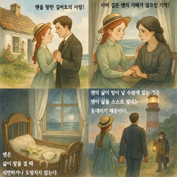 앤의 삶이 빛날 수밖에 없는 것은 앤이 삶을 스스로 빛내는 등대이기 때문이다. 앤은 자기만 빛을 내는 게 아니라 그 빛으로 타인의 길을 비출 줄 아는 너그러움을 가졌다. 그 매력에 길버트도 빠진 게 아닐까.