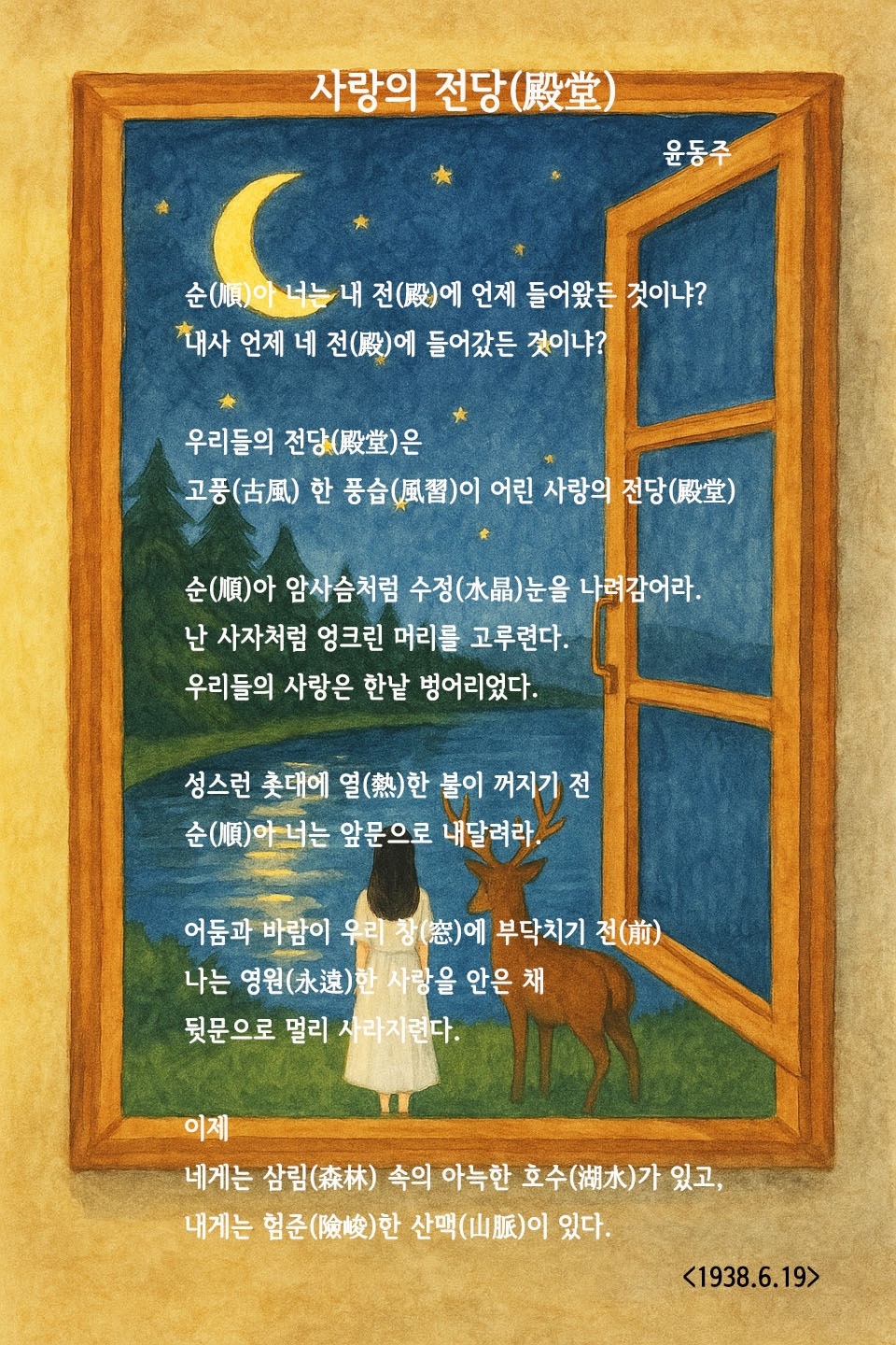 시인은 ‘사랑의 전당’에 자연을 담았고 상대에게는 아늑함을 주었다. 어쩌면 ‘사랑의 전당’은 추억일지도 모르겠다. 아름다운 추억을 주고 싶은 시인의 마음일지도 모르겠다. 별과 자연을 노래한 시인이지 않은가!