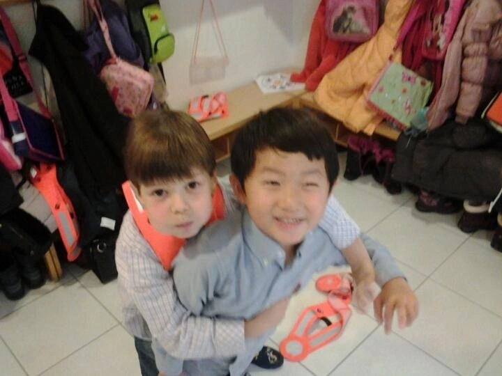 유치원 공개 수업에도 유모차에 태워 갔었다. 둘째 아기 챙기느라 조금 늦게 갔더니 이탈리아 아이 에어클디뎃이 우는 첫째를 괜찮다며 달래주고 있었다. 엄마가 오니 활짝 웃어 보인다.