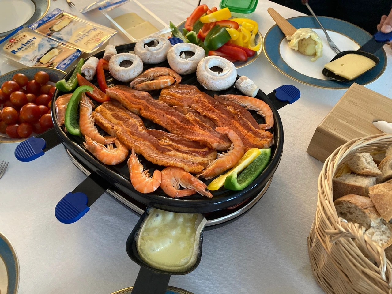 라클렛 기계와 퐁듀 기구를 가져오신다기에 2일 전부터 라클렛 치즈와 퐁듀 치즈를 사두었다. 그리고 오시기를 기다리는데 역시 우리의 기대를 저버리지 않으셨다. 새우와 빨간 삼겹살, 피클, 버섯, 파프리카, 아이스크림 등등 많이도 사 오셨다. 라클렛 기계에다가 라클렛 치즈를 넣고 그 위에 삼겹살과 새우 파프리카를 올리고 구워 먹었다.