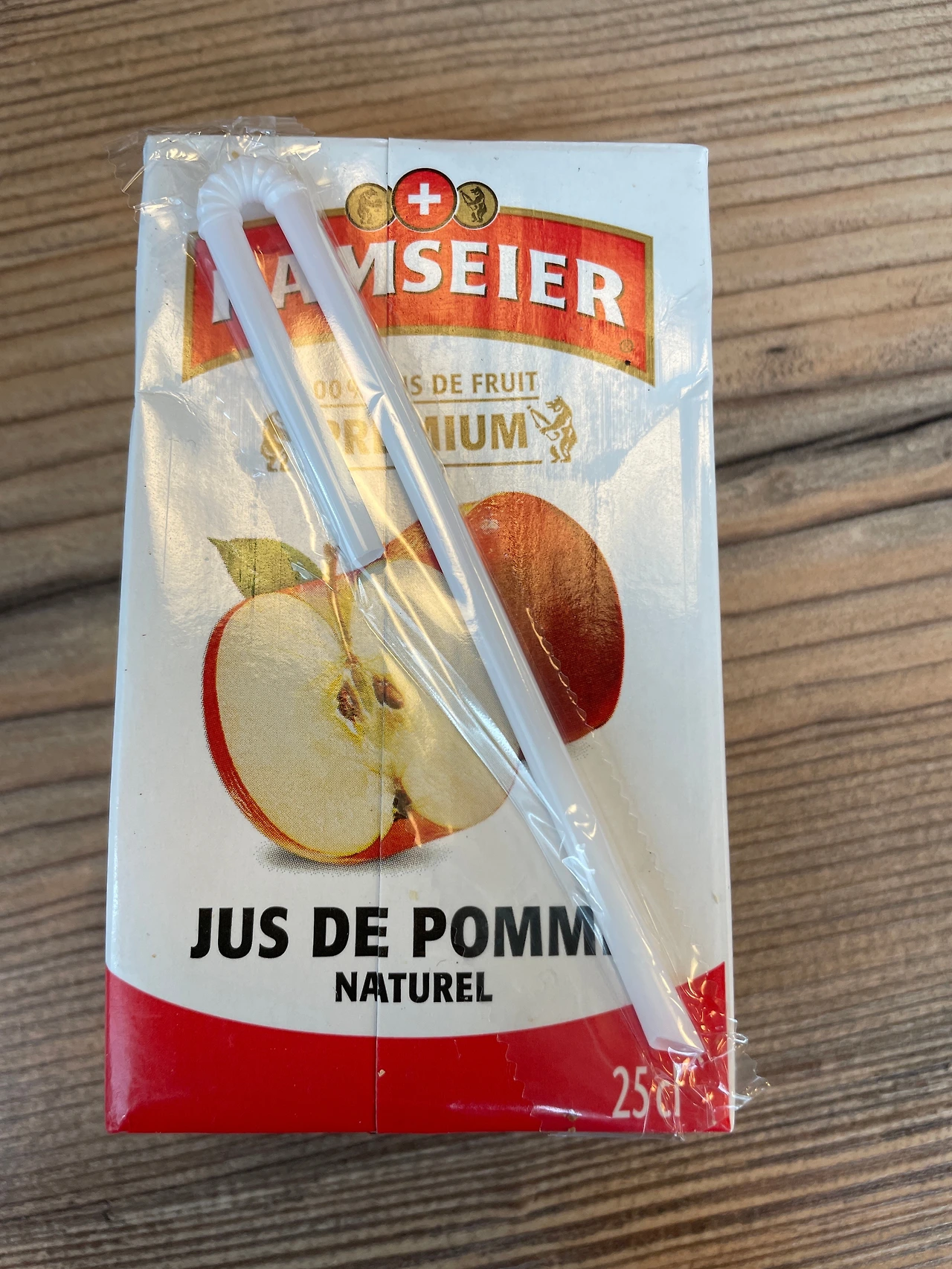 사과를 좋아하는 아이들이 학교 갈 때마다 아침 간식으로 꼭 챙겨가는 것도 사과주스예요. 건강에 좋을 것 같은 맛이고요. 이건 스파클링 없어요. (프로데가 - 한 박스 27개 1개당 25cl 0.82프랑)