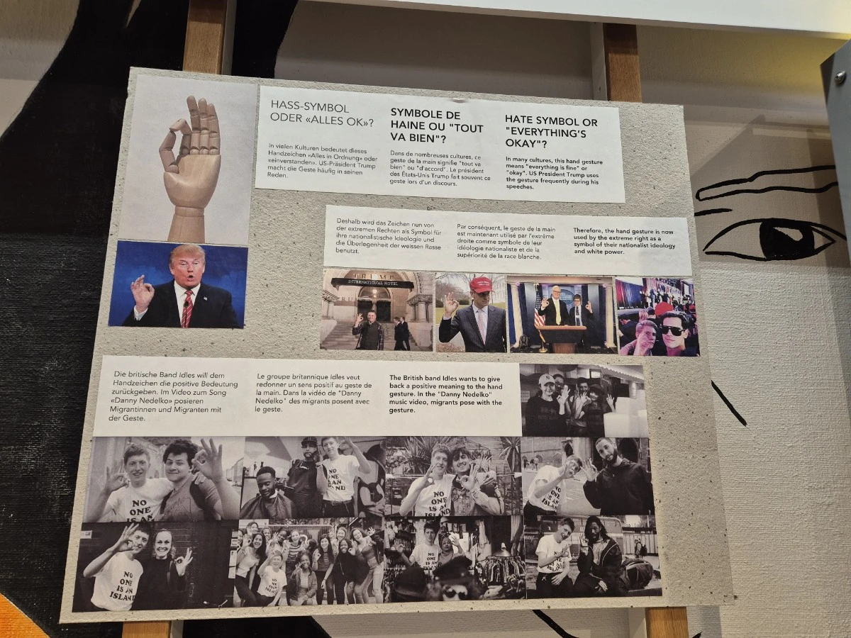 그리고 옆에 극우를 상징하는 엄지와 검지 손가락으로 만든 동그라미 손가락 표시를 하고 있는 사람들이 있어요. 원래 괜찮냐는 O.K표시로 사용되던 손가락 표시를 트럼프 대통령이 백인우월주위로 사용해요. 그런데 영국의 밴드가 유색 피부인 사람들과 같은 손가락 표시를 하며 의미를 뒤집어요. 그렇게 우리는 함께 멋지다는 메세지를 전해요.