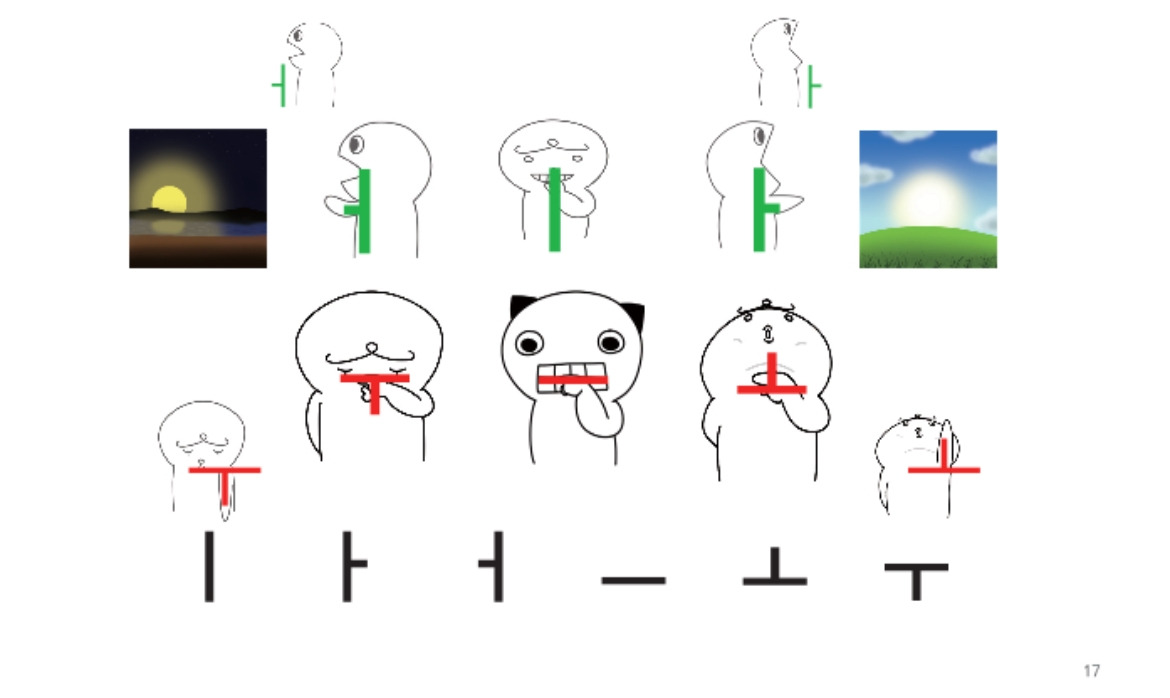 그래서 유튜브를 보면서 한글을 익힐 수 있도록 학습지를 만들었다. 먼저 모음의 •가 하늘을 ㅡ가 땅을 ㅣ가 사람을 의미한다는 것을 알려주며ㅣ, ㅏ, ㅓ , ㅡ, ㅗ, ㅜ를 익히며 획에 따라 머리를 움직이며 쉽게 외울 수 있도록 아래 그림을 보여주었다.