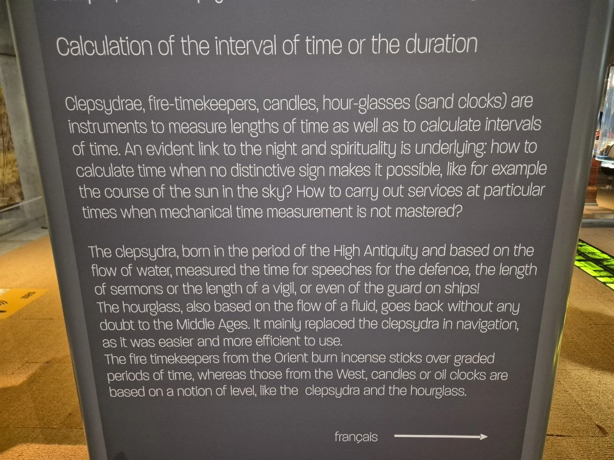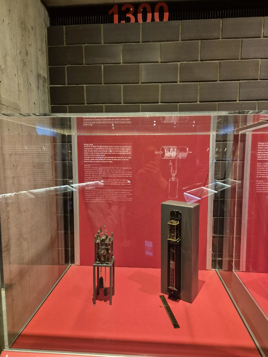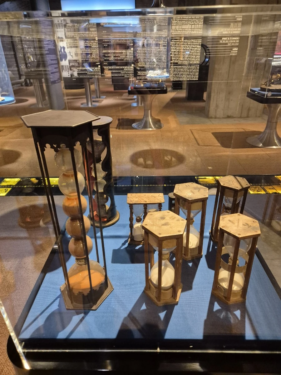 올라가면서 보니 역사 순서대로 제작된 시계가 전시되어 있어요. 아래 물 시계는 기원전 1400년경 이집트에서 만들어졌다고 하네요. 옆에는 모래시계가 있어요. 옛날에는 물과 모래가 지나는 일정 시간의 길이를 측정해서 시간 간격을 계산하는 도구로 활용했지요.