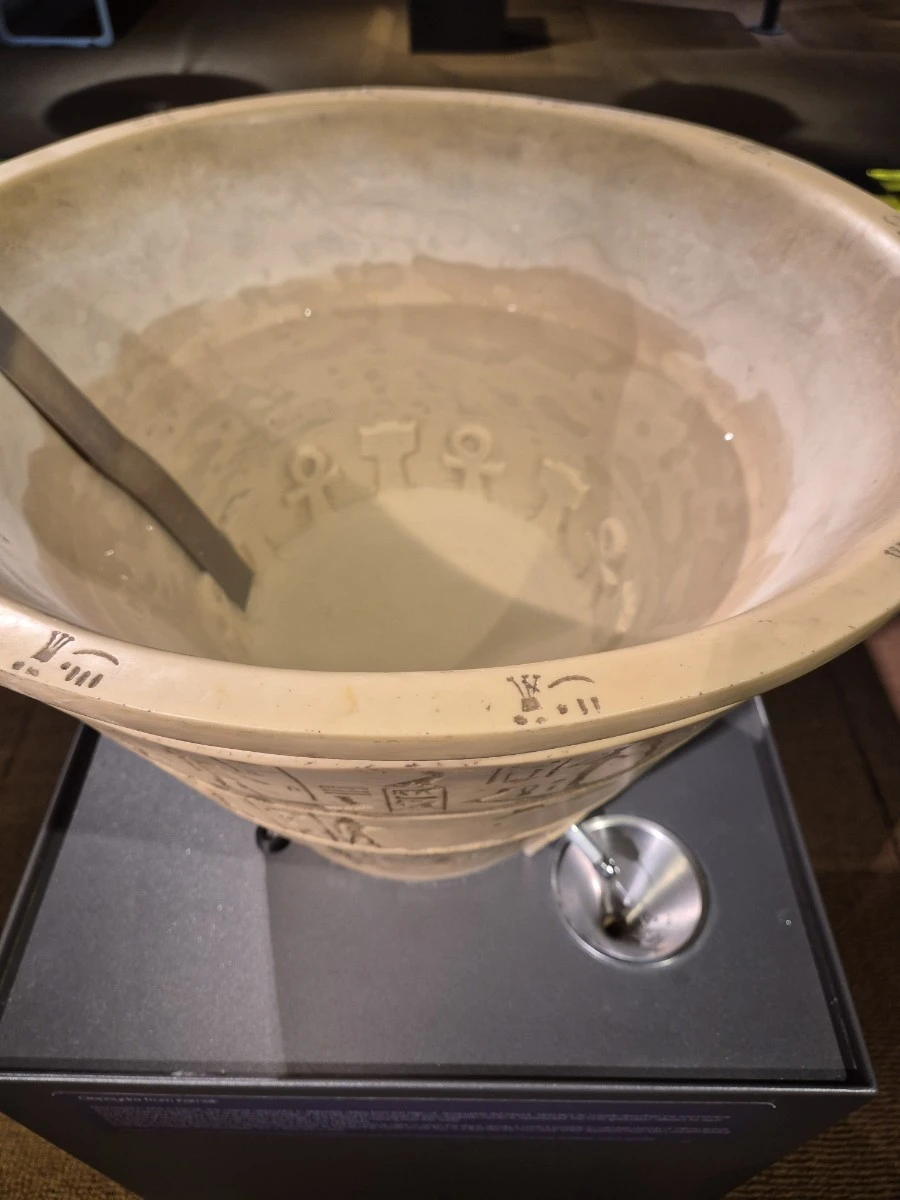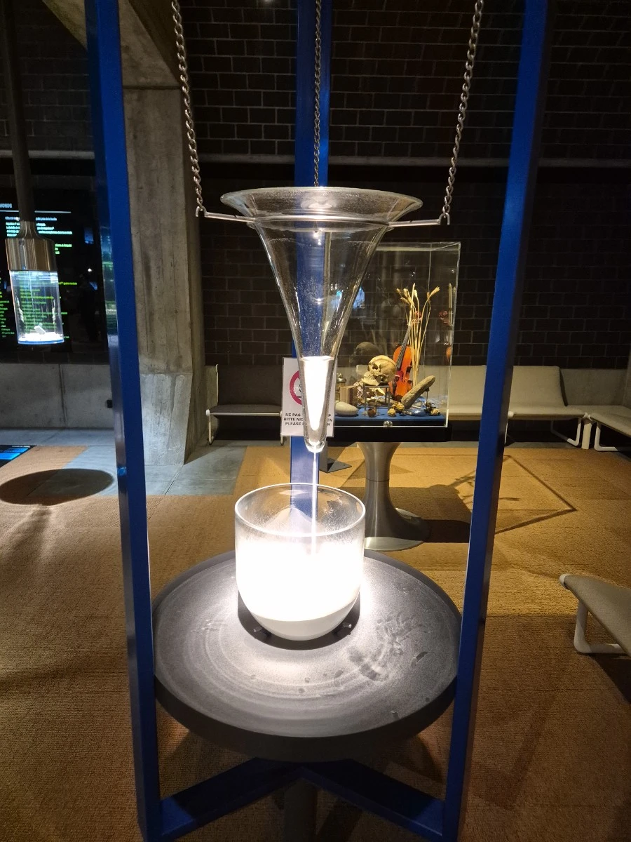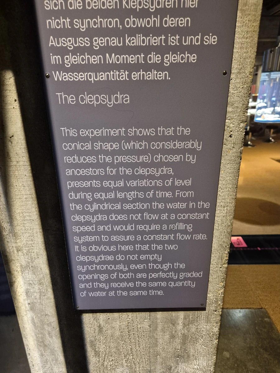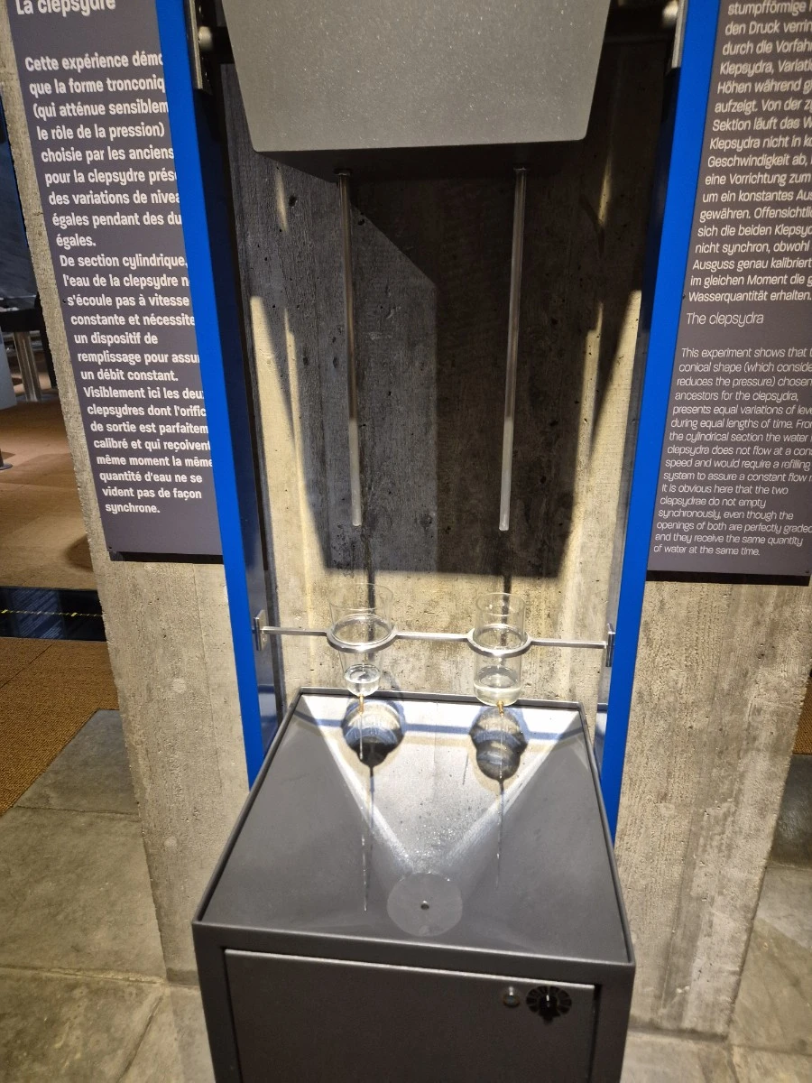 물시계 근처 벽면에 물시계가 왜 원뿔 모양으로 되어 있는지 실험도구로 보여 주고 있어요. 원통형 모양보다 원뿔 모양이 같은 시간 동안 동일한 물 흐름이 보인다고 하는데 물이 흘러가는 것을 직접 보니 이해가 되네요. 원통형 모양은 물이 완벽하게 안 빠지고 바닥에 조금씩 남기도 하니까요. 마찬가지로 모래시계도 원뿔형 모양이에요.