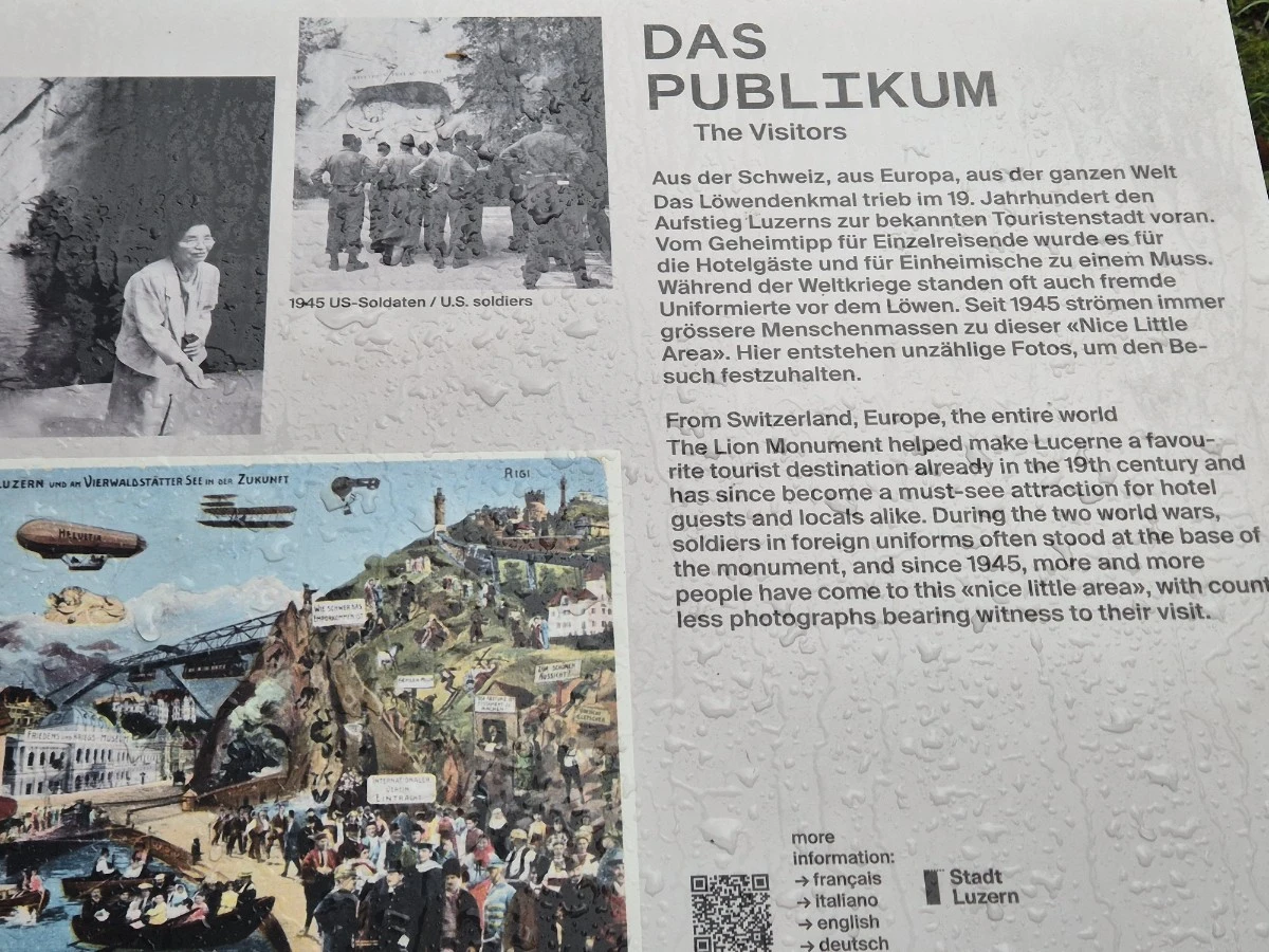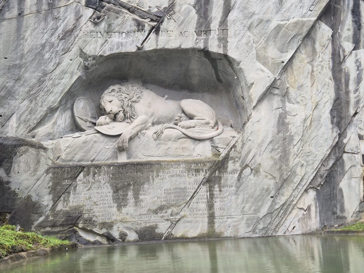 바로 옆에 유명한 빈사의 사자상이 있어요. 대부분의 사람들은 빙하 공원과 더불어 꼭 보고 오는 명물이에요. 저도 마찬가지로 빙하 공원 보기 전에 화살에 찔려 신음하며 죽은 듯한 사자상을 먼저 지켜보았어요. 이 사자는 프랑스 대혁명 때 루이 16세와 마리 앙뜨와네뜨를 지키기 위해 끝까지 자리를 지켰던 스위스 군인들을 상징해요. 현재 잘 사는 스위스도 불과 200-300여년 전만 해도 용병을 다른 나라에 보내 돈을 벌어 오는 나라였죠. 슬프면서도 끝까지 자신의 역할을 다했던 사자의 모습이 마음 속 깊은 울림이 되어요. 가신다면 이건 공짜이니 꼭 보고 오세요.