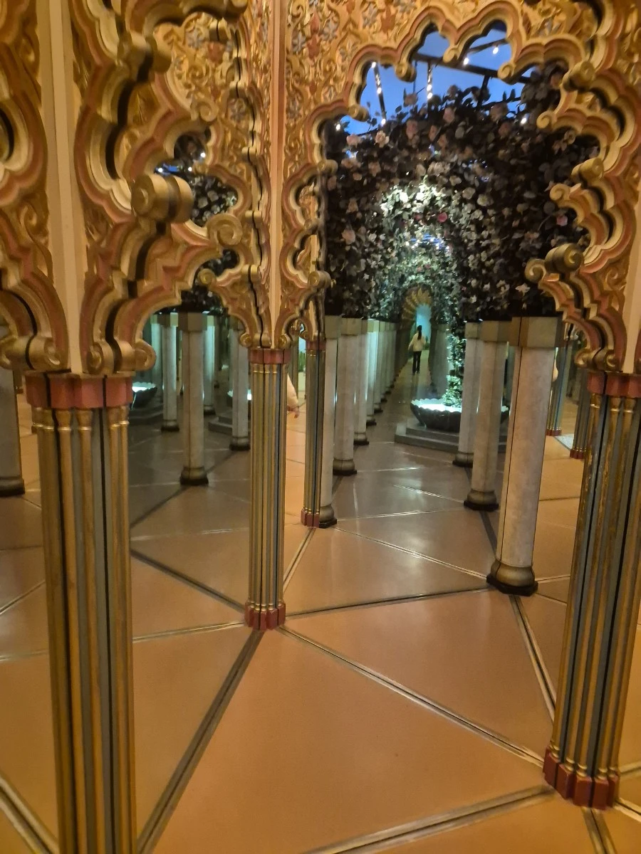 특히 아이들이 특히 좋아했던 곳은 거울 미로였어요. 이 곳은 스페인 남부 그라나다에 위치한 웅장한 성 알함브라 궁전의 모형으로 설계되었지요. 곳곳에 사자 분수, 장미 정원이 꾸며져 있는데 거울안에 있어 전부가 아닌 일부(1면만)가 거울에 비춰 동그란 완성된 형태로 보여져요. 입구를 통해 들어가면 6면중 5면이 거울로 둘러싸여 있고 1면만 뚫려 있어서 맨 처음 들어갈 때는 출구를 어떻게 찾아야 할지 몰라 거울에 부딪치기도 하며 여러번 시행착오를 겪었어요.