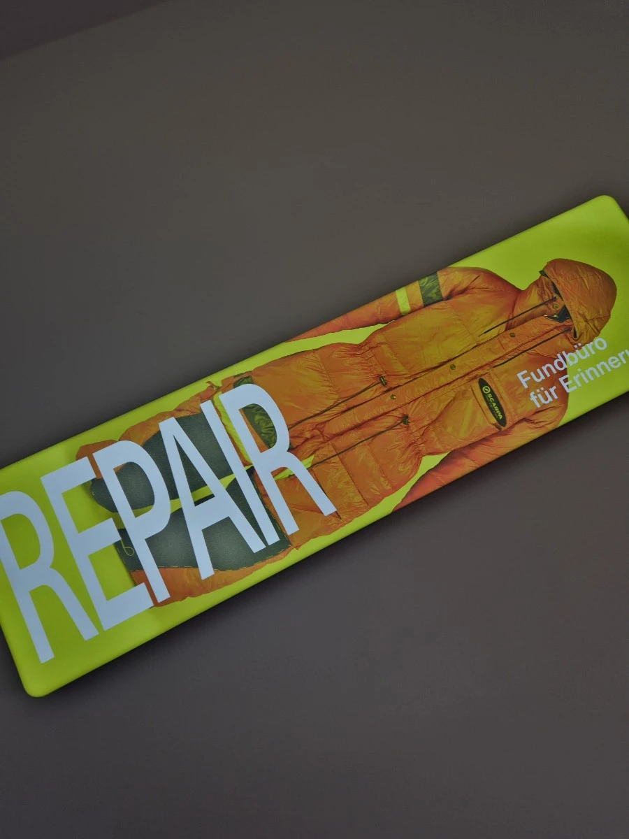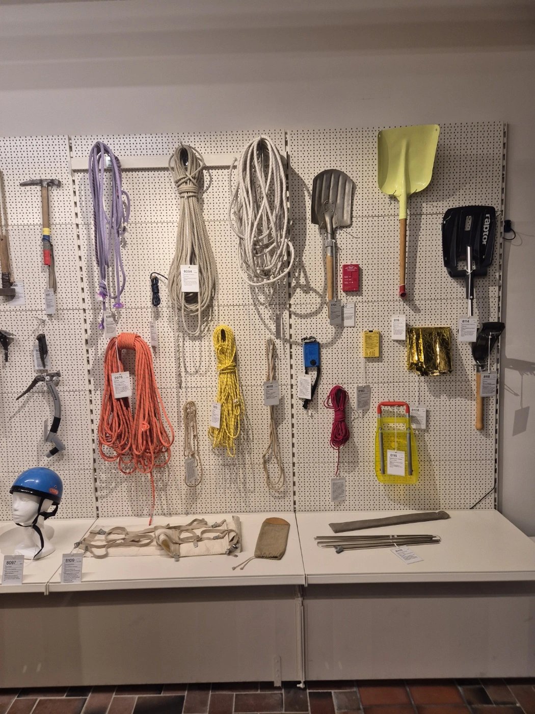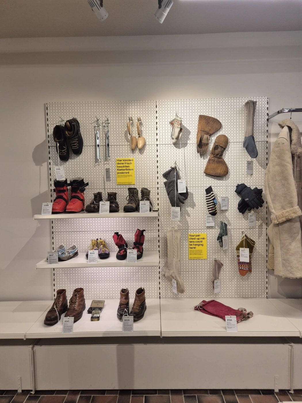 지하 1층 내려가는 길에 수선에 관한 사진을 볼 수 있어요. 등산 용품과 수선에 관한 전시가 이어질 것을 예상하며 내려갔어요. 입구에서 등산에 사용되었던 신발과 등산 옷 등등이 전시되어 있었는데 버려질 물건들의 이야기를 찾아내어 설명을 써 놓고 깔끔한 옷걸이와 정갈한 구역 안에 넣어 놓았어요.