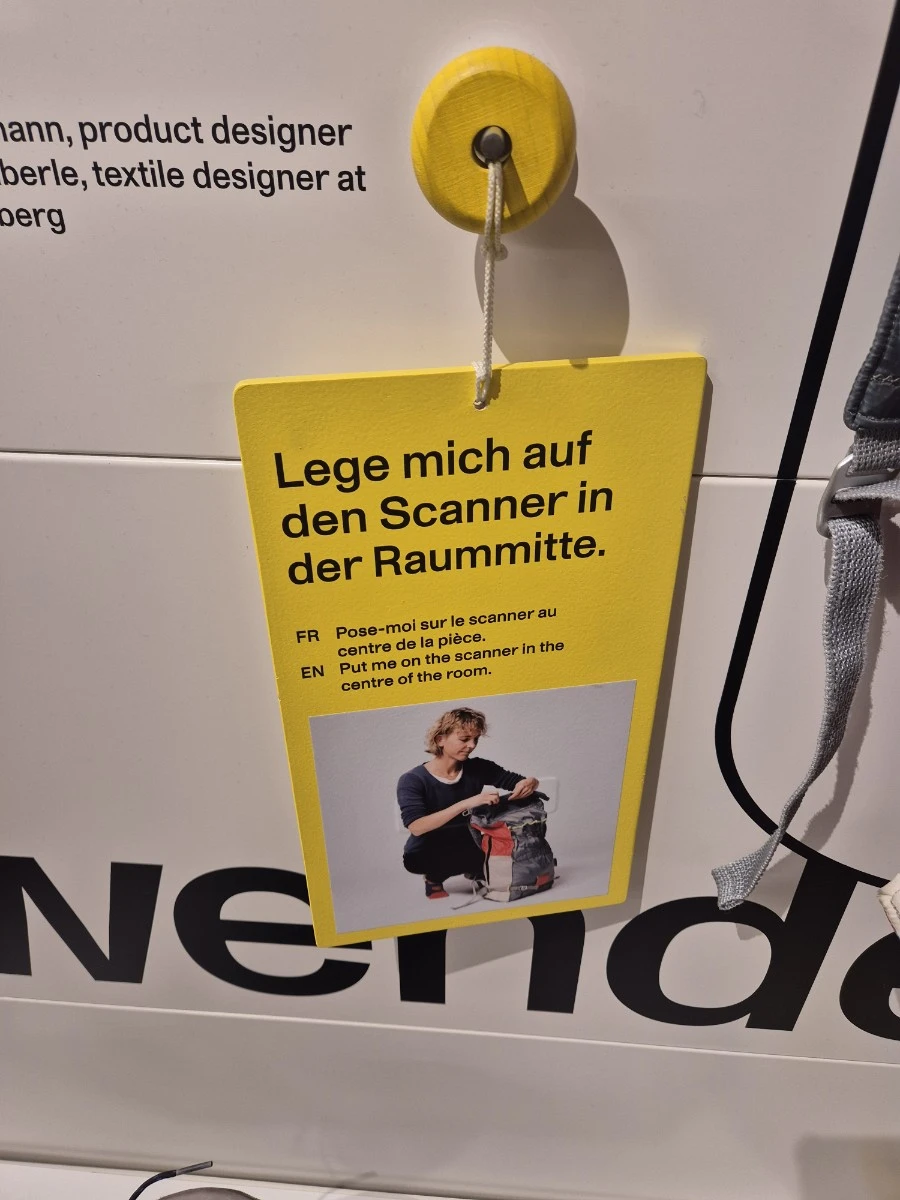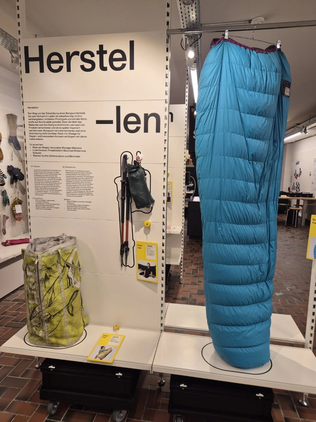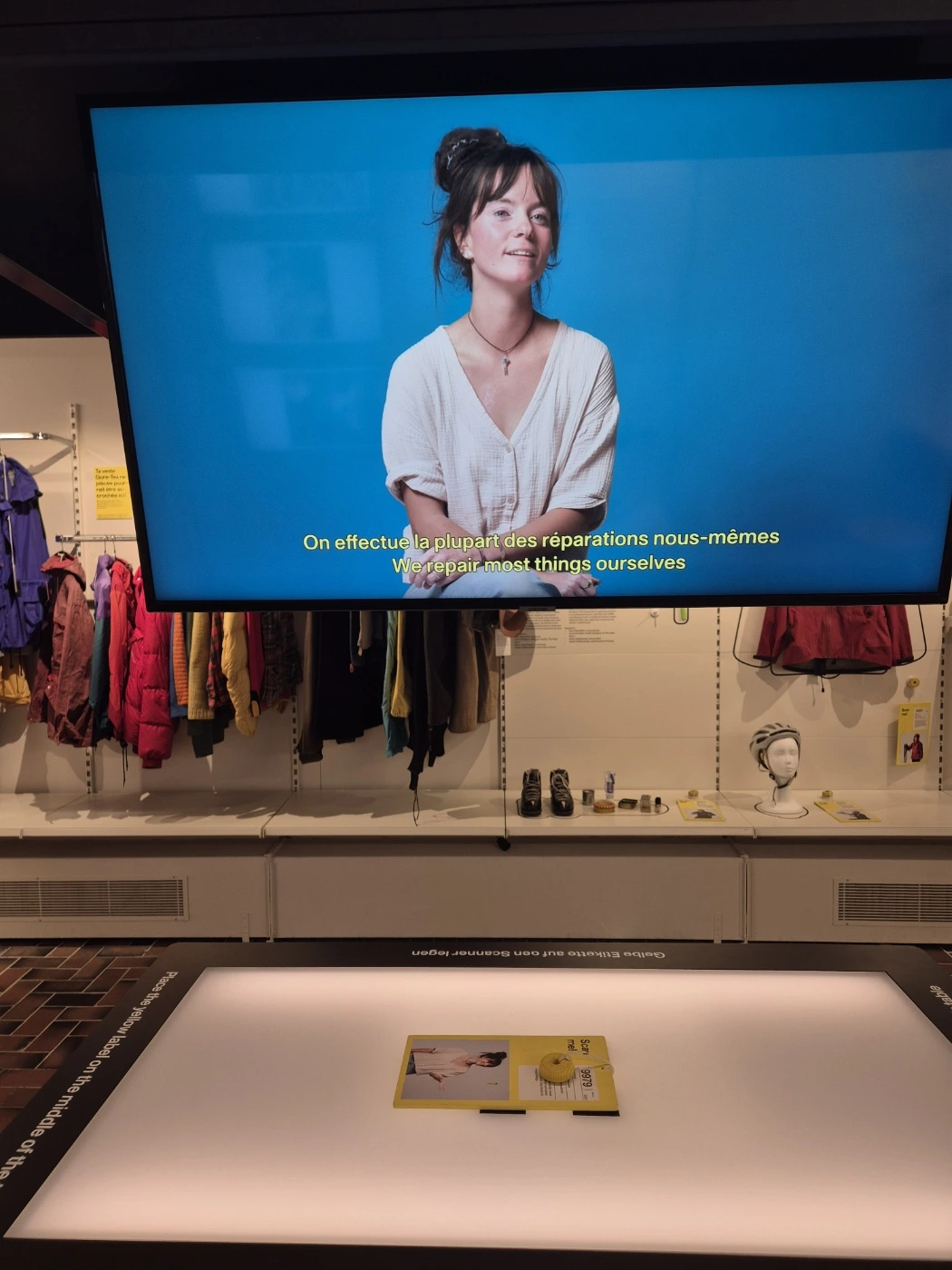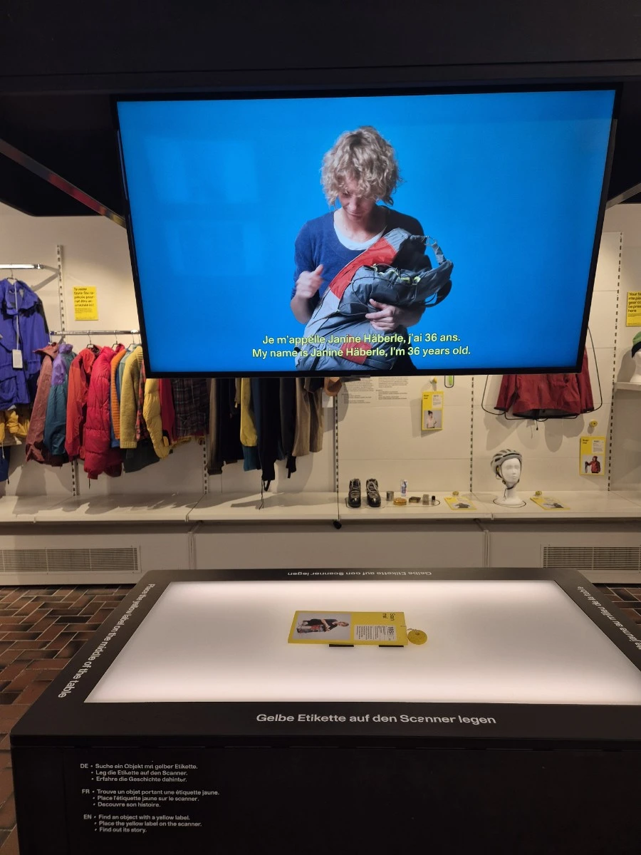 동그란 노란색에 실로 이어진 노란색 네모 QR코드 설명판을 영어, 독일어, 불어, 그리고 한가지 언어 더 해서 네가지 면으로 되어 있는 탁자에 놓으니 설명을 들려 주네요. 영어 쪽을 향해 설명판을 놓으니 영어로 물건에 대한 설명이 나와요. 등산 가방을 수선하는 이야기, 업그레이드 해서 제품을 만들어 놓은 설명을 해주었어요. 생각해 보니 등산에 있어서 등산 용품은 실과 바늘처럼 뗄레야 뗄 수 없는 존재인데 거기에다가 혹시 망가질 것을 대비해서 수선을 해가며 해야 오랜 산행, 하고자 하는 목표를 이루어 갈 수 있었을 것 같아요. 수선도 어느 정도 할 수 있는 장비는 필수네요.
