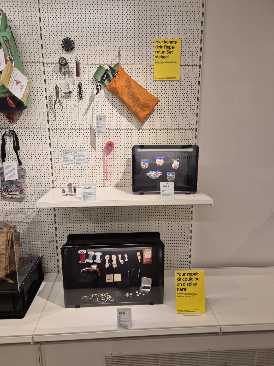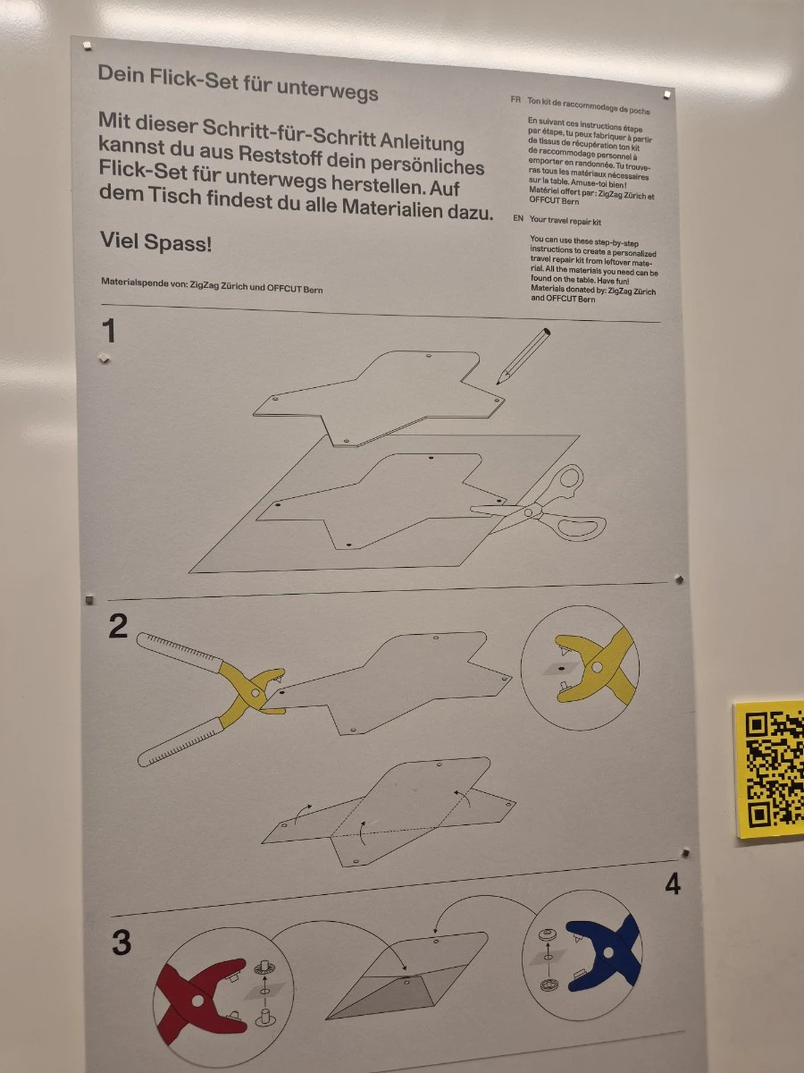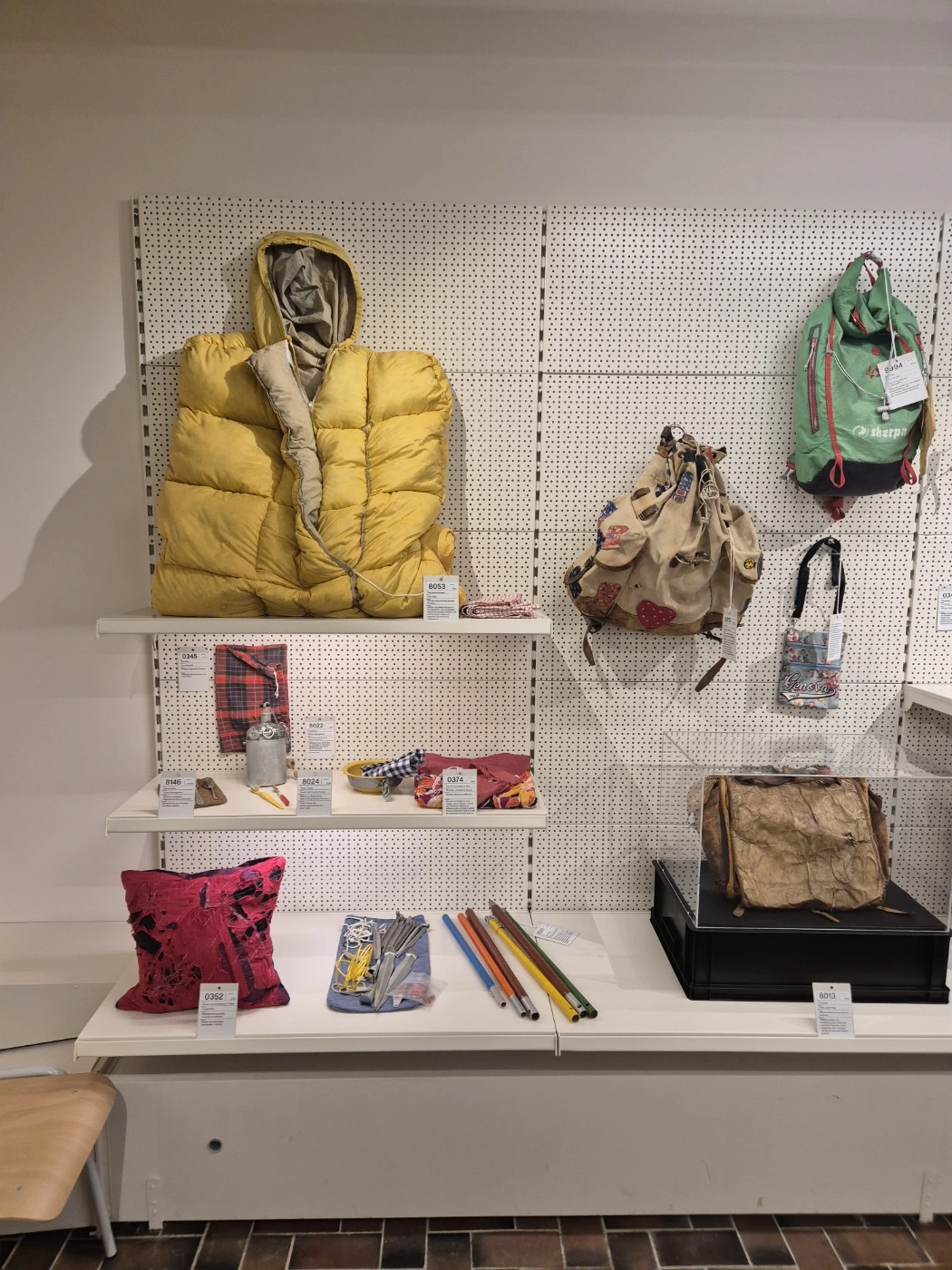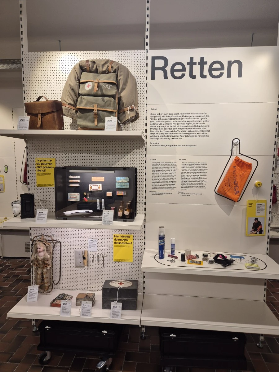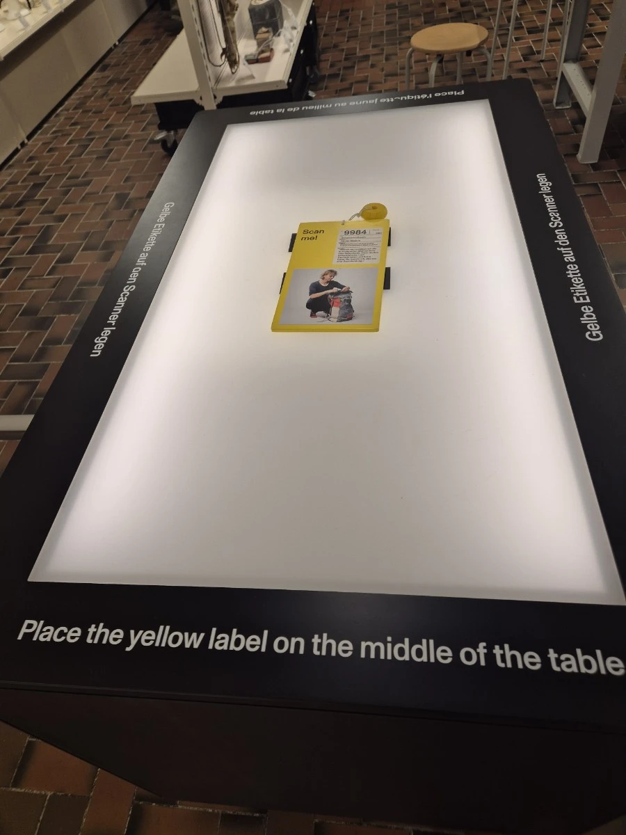 동그란 노란색에 실로 이어진 노란색 네모 QR코드 설명판을 영어, 독일어, 불어, 그리고 한가지 언어 더 해서 네가지 면으로 되어 있는 탁자에 놓으니 설명을 들려 주네요. 영어 쪽을 향해 설명판을 놓으니 영어로 물건에 대한 설명이 나와요. 등산 가방을 수선하는 이야기, 업그레이드 해서 제품을 만들어 놓은 설명을 해주었어요. 생각해 보니 등산에 있어서 등산 용품은 실과 바늘처럼 뗄레야 뗄 수 없는 존재인데 거기에다가 혹시 망가질 것을 대비해서 수선을 해가며 해야 오랜 산행, 하고자 하는 목표를 이루어 갈 수 있었을 것 같아요. 수선도 어느 정도 할 수 있는 장비는 필수네요.