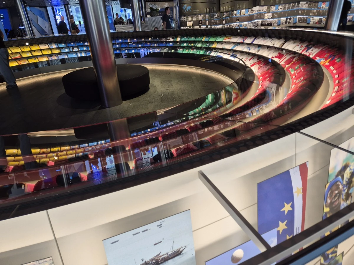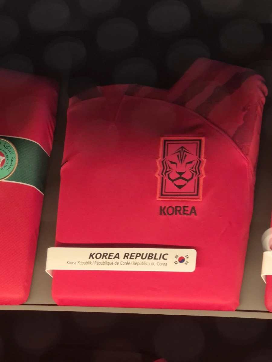 일단 도착하면 표를 사야 하는데 역시 패밀리 연간 뮤지엄 패스로 그냥 들어갔어요. ( 어른 - 26프랑, 어린이 - 15프랑 / 온라인으로 구입하면 1프랑씩 할인, 가족은 어른 2명, 아이 2명 - 65프랑) 입구 근처에 동그랗게 빨, 주, 노, 초, 파, 남, 보 무지개색깔별로 유니폼이 전시되어 있었는데 그중에 한국 유니폼을 찾았어요. 빨간색 태극무늬가 붙은 유니폼이 딱 눈에 띄어요.