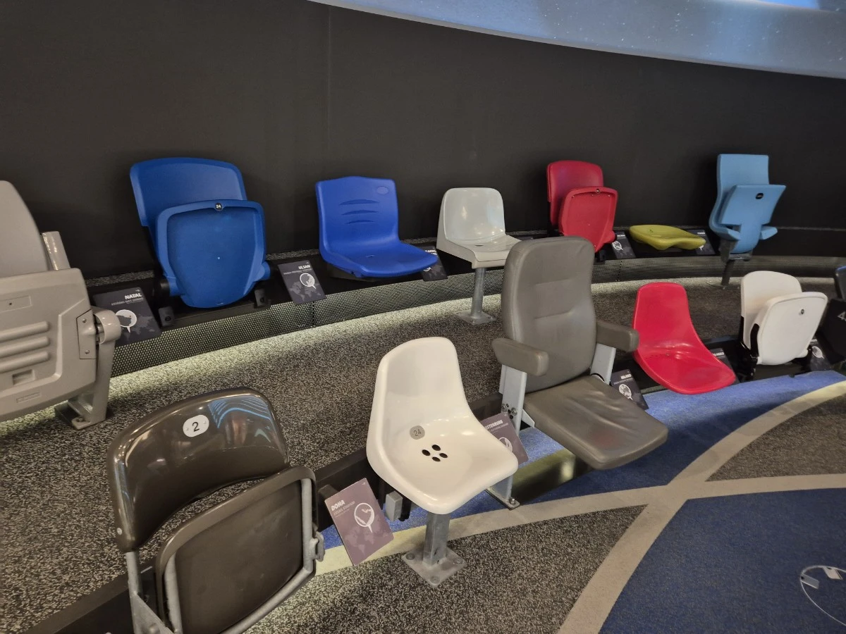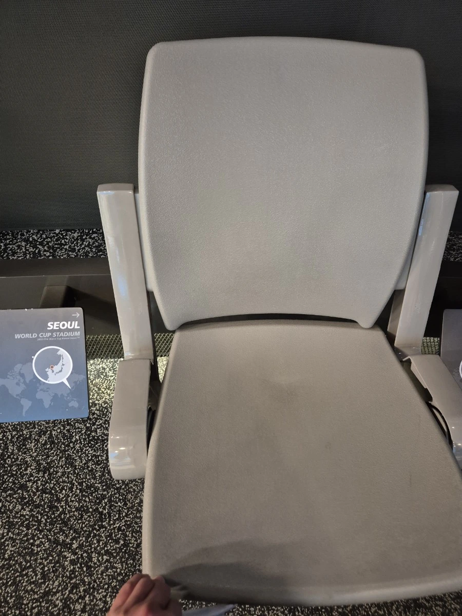 한편에 의자들이 놓여 있어 의아했는데 자세히 살펴보니 월드컵에 사용되었던 의자였어요. 월드컵마다 거의 다른 의자였다는 사실도 처음 알았죠. 별생각 없었는데 의자를 찾아보니 한국 월드컵 때는 회색이었어요. 빨간색, 파란색, 회색, 접히는 의자, 안 접히는 의자 다양해요.