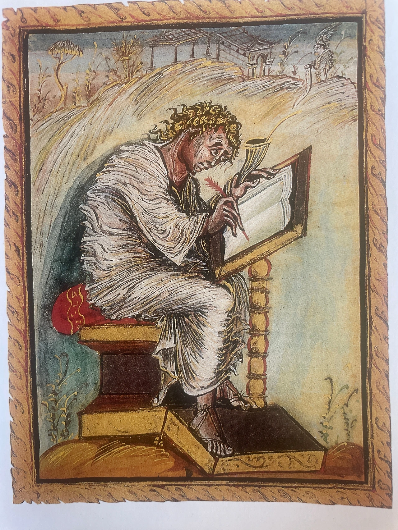 아래 <성마태오> 그림도 중세 그림이에요. 예전에는 암흑기의 시선으로 보았다고 한다면 이제는 잔뜩 긴장한 채로 한 자 한 자 쓰고 있는 모습에서 경건함이 느껴져요.