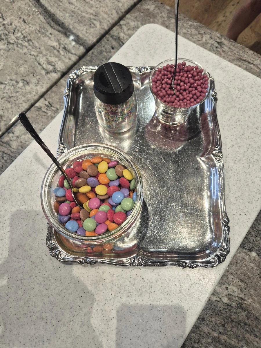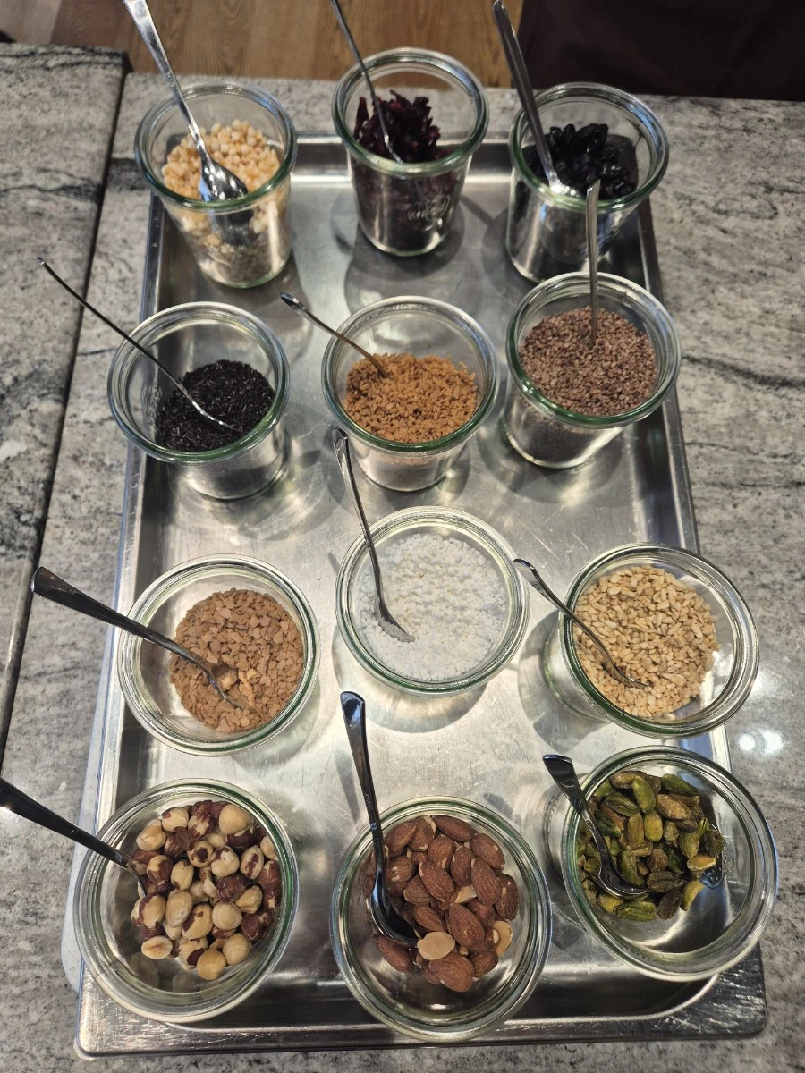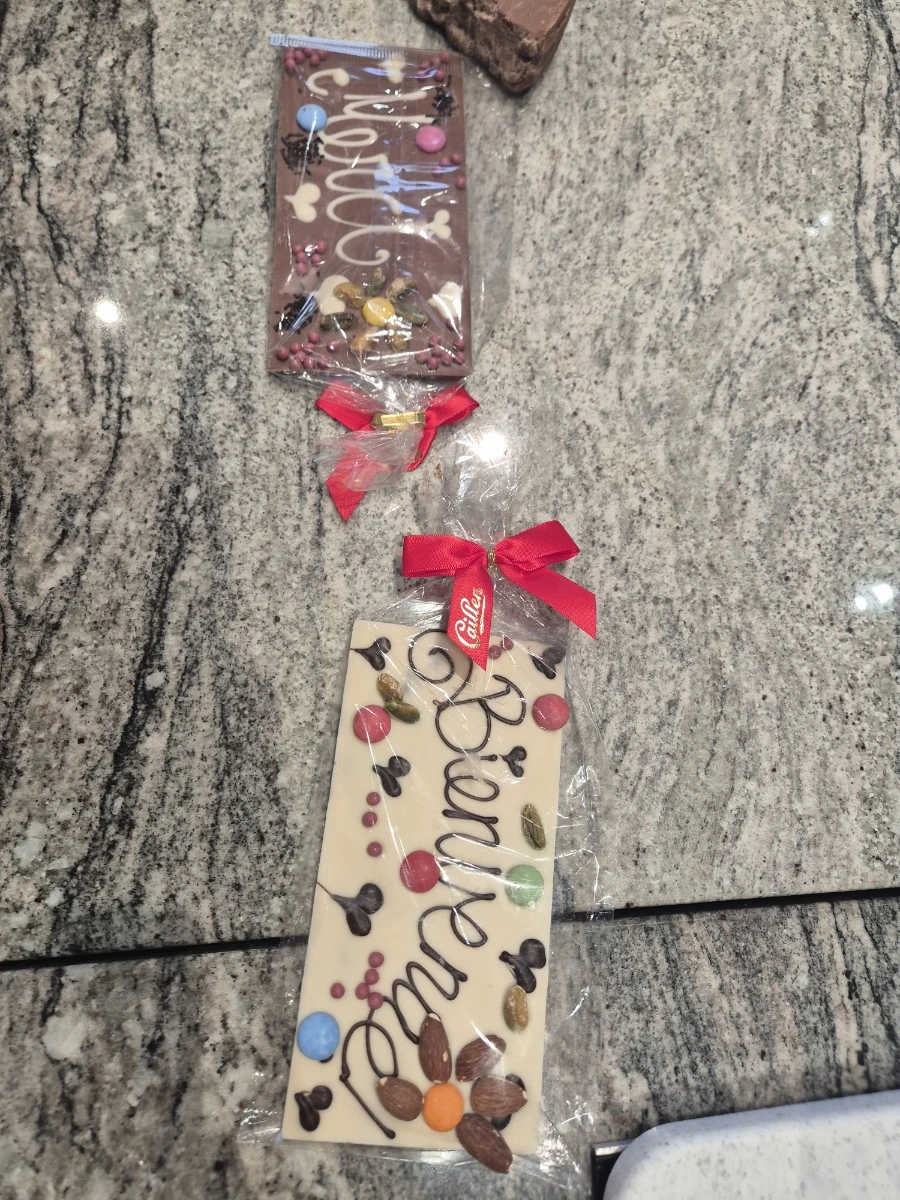 그 안에 여러 가지 토핑을 넣을 수 있었어요. 아몬드와 같은 너트 종류 서너 가지, 그리고 건 블루베리와 같은 건과일류 서너 가지, 작은 조각으로 만들어진 초콜릿, 캐러멜과 같은 달콤한 사탕류도 각각 서너 가지씩 있었어요. 녹인 초콜릿과 토핑 6~7숟가락을 골고루 섞어 플라스틱 모양 바 위에 부었어요. 그리고 그 위에 여러 토핑들로 장식을 했어요. 저는 아이들의 이름을 한 글자씩 새겨 넣었지요. (제가 만든 초콜릿은 집에 돌아오는 길에 녹아버렸어요. ) 이후 바로 초콜릿의 온도를 조절해서 굳게 하는 기계 안에 넣었어요. 10분 남짓 기다리니 초콜릿이 완성되었어요. 먼저 초콜릿 선생님의 시범을 보고 따라 만들었는데 선생님의 초콜릿 완성 작품은 아래 오른쪽과 같아요.