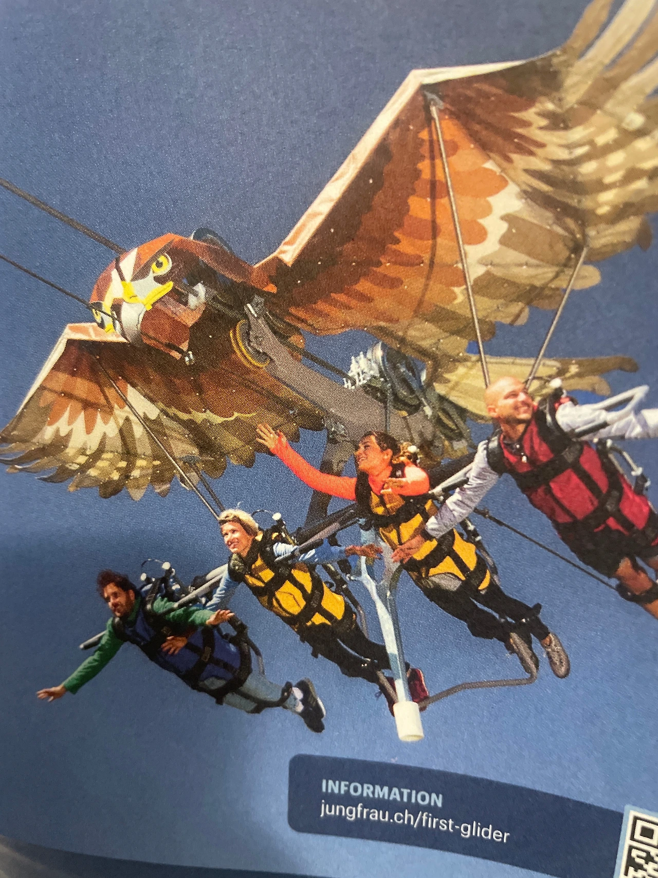 이번에는 어른인 저도 함께 탔어요. 글라이더는 타는 곳에서 표를 팔고 있어요. 대충 볼 때는 새 모양 놀이기구를 위에서 쭉 내려오는 것인 줄 알았는데 자세히 보니 아래에서 위로 쭉 올라갔다가 내려오더라고요. 처음 타 보았는데 고리가 달린 두꺼운 안전장치 조끼를 입고 그 고리를 새 모양 기구에 걸어요. 이 안전장치는 중요해서 전문가가 직접 고리에 채워줘요. 잘못해서 사고 나서 떨어지면 큰 일 나니까요.