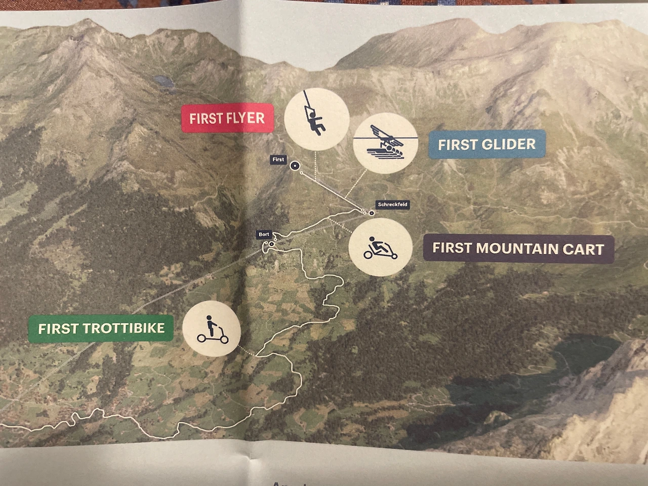 곤돌라를 한참 타고 올라가니 꼭대기 피르스트에 도착했어요. 날씨기 참 좋아서 하늘이 참 맑았어요. 벌써 12시가 조금 넘어 점심으로 싸 온 주먹밥을 맛있게 먹었고요. 산에서 먹으니 더욱 꿀맛이었죠. 배를 일단 채우고 뭘 탈까 보는데 새처럼 생긴 놀이 기구 글라이더가 눈에 들어와서 어디서 줄을 서야 하나 두리번거리는데 우연히 한국분을 만났어요. 그분이 친절하게 글라이더는 피르스트가 아니라 내려가야 한다고 하셔서 다시 곤돌라를 타고 슈렉펠드(Schreckfeld)로 갔지요.