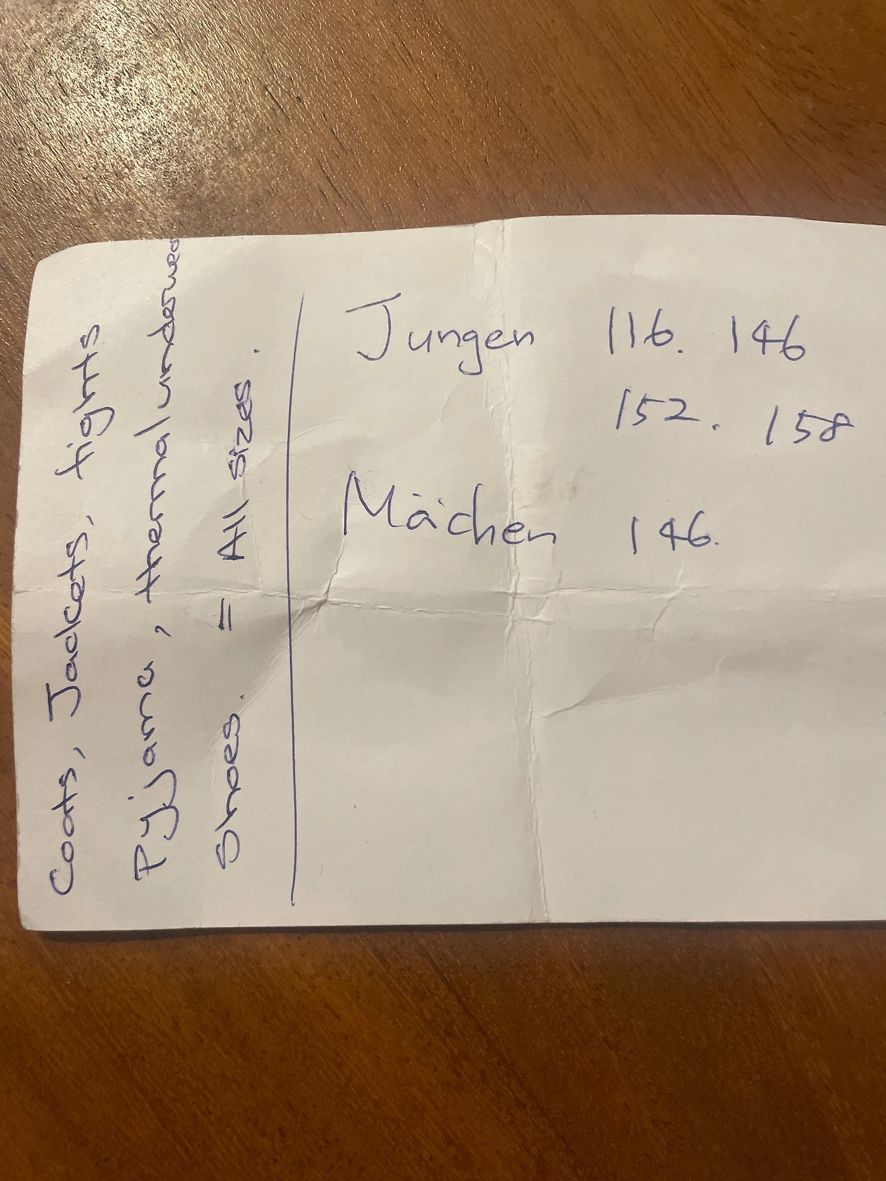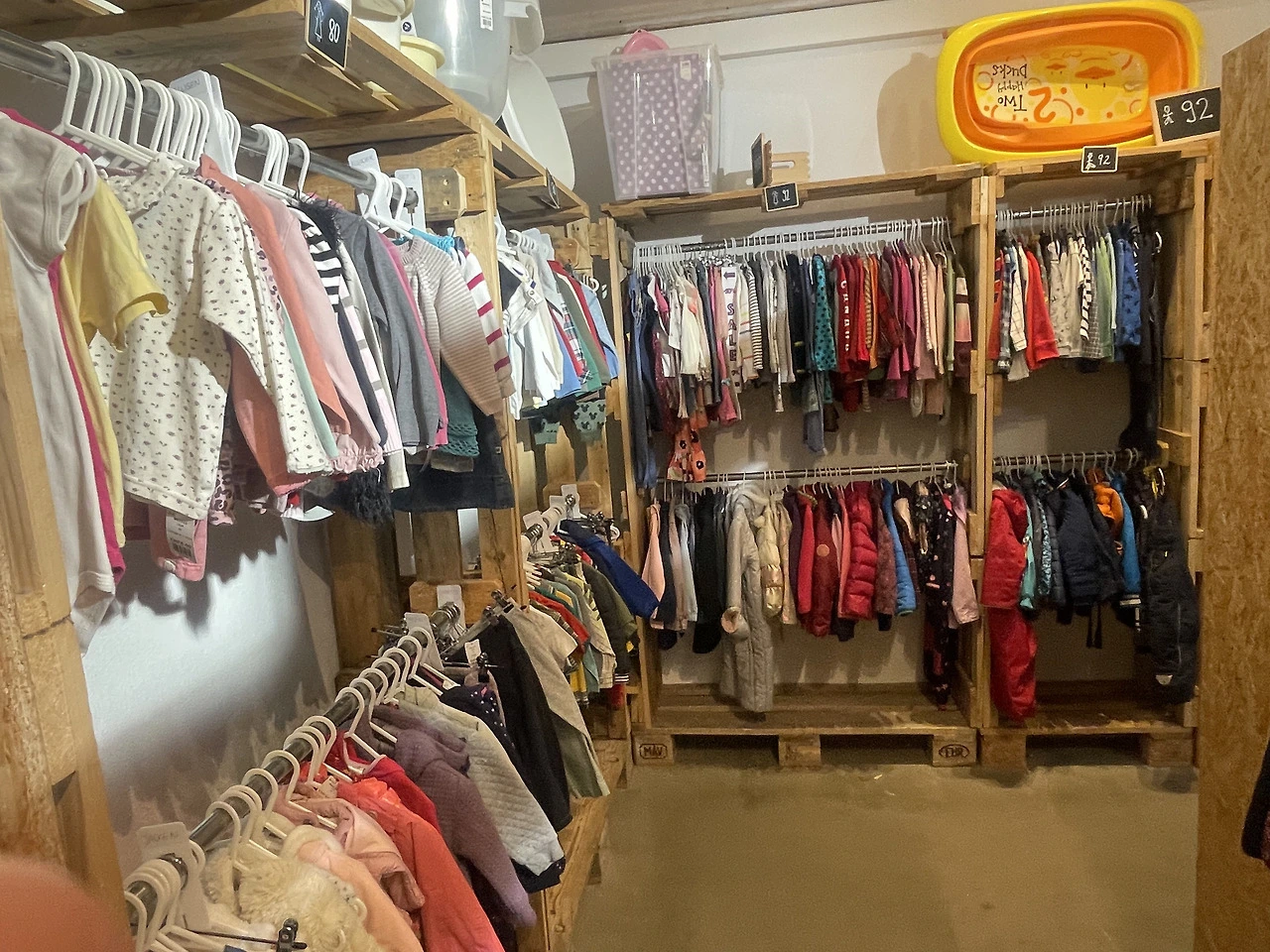 이번에는 스위스에 온 지 일 년 지나자 아이들에게 작아진 옷들이 산더미처럼 쌓여 가져다주러 갔어요. 먼저 아이옷을 가져가도 되는지 물었지요. 직원은 이미 아이옷이 많이 가득 차서 다 받을 수 없고 여자 아이옷 146 사이즈, 남자아이옷은 116, 146, 152, 158 이렇게 필요한 옷을 적어주네요. 그리고 이제 겨울이라 그런지 코트, 겨울재킷, 타이즈, 잠옷이나 기능성 내복, 신발은 모든 사이즈 다 받는다고 하고요. 운이 좋게 쌍둥이와 둘째 작아진 옷이 딱 그 사이즈가 맞아서 옷을 들고 갔어요. 어떻게 옷을 받는지 돈을 돌려받는 구조인지 궁금했거든요.