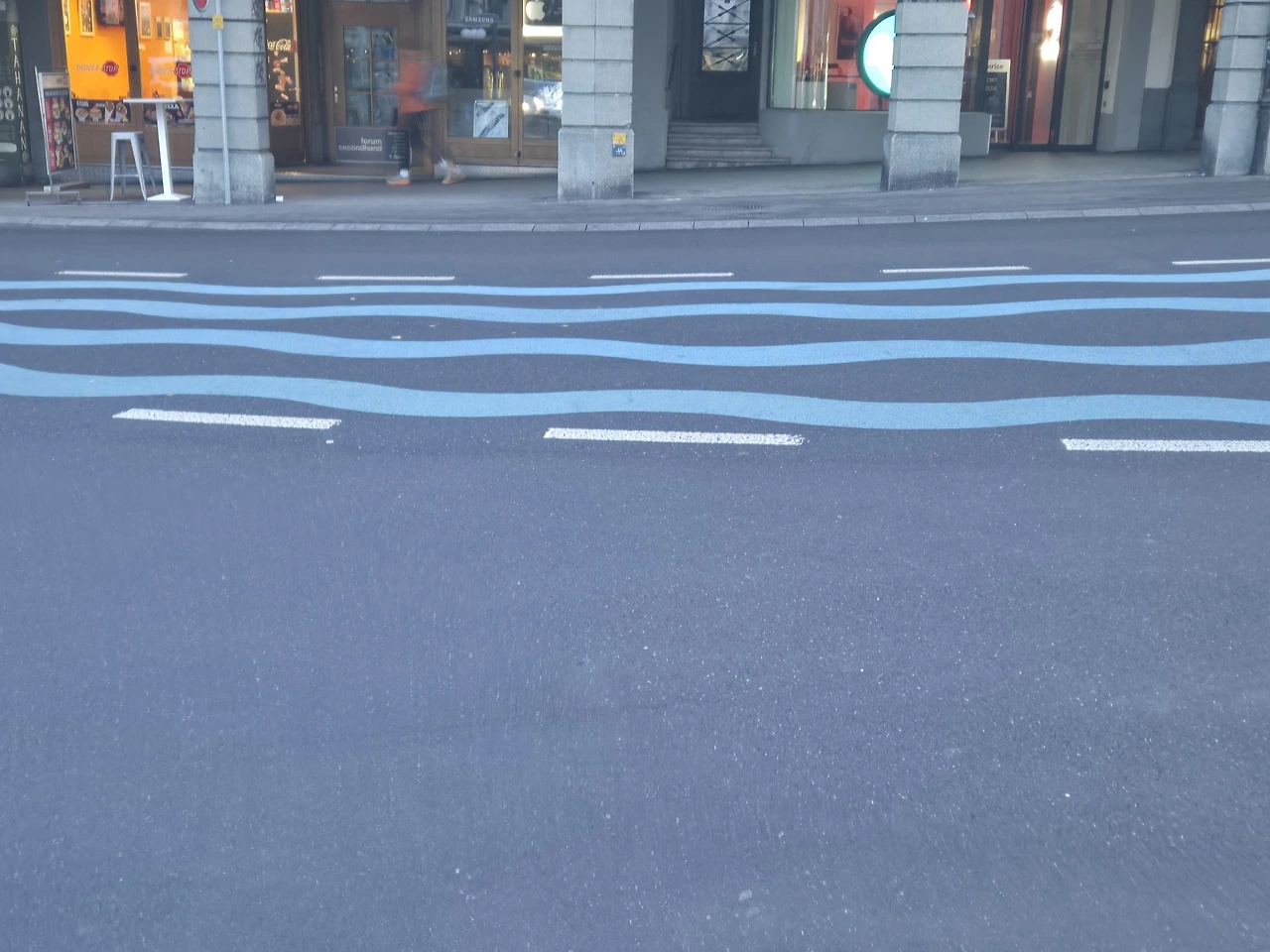 아름다운 툰성과 교회 산책로를 한참 걷고 이번에는 구시가지를 걸었어요. 도로에 재밌는 파란색 물결 무늬 교통 표시가 보여 구글 검색으로 이 표시가 무슨 의미인지 물었더니 도로의 흐름을 방해하지 않으면서 보행자가 차를 확인하며 길을 건너라는 뜻이라네요. 유럽에서 시험용으로 사용하기 시작한 표시라는데 참신하네요. 스위스는 워낙 신호등 신호 지키지 않고 눈치껏 걷는 사람들이 많아 혼잡한 도로가 아니면 융통성 있는 신호가 더 좋은 것 같아요.