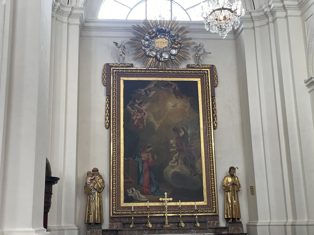 화려한 바로크 양식 외관과 더불어 하얀 대리석으로 장식된 내부도 너무 아름다워요. 벽에도 꽤 수준 높은 그림들이 걸려 있어서 누가 그렸는지 찾아보았어요. 이탈리아 화가로 나오네요. 성전화뿐만 아니라 고개를 들어 천정을 보니 그곳에도 훌륭한 그림이 있네요.