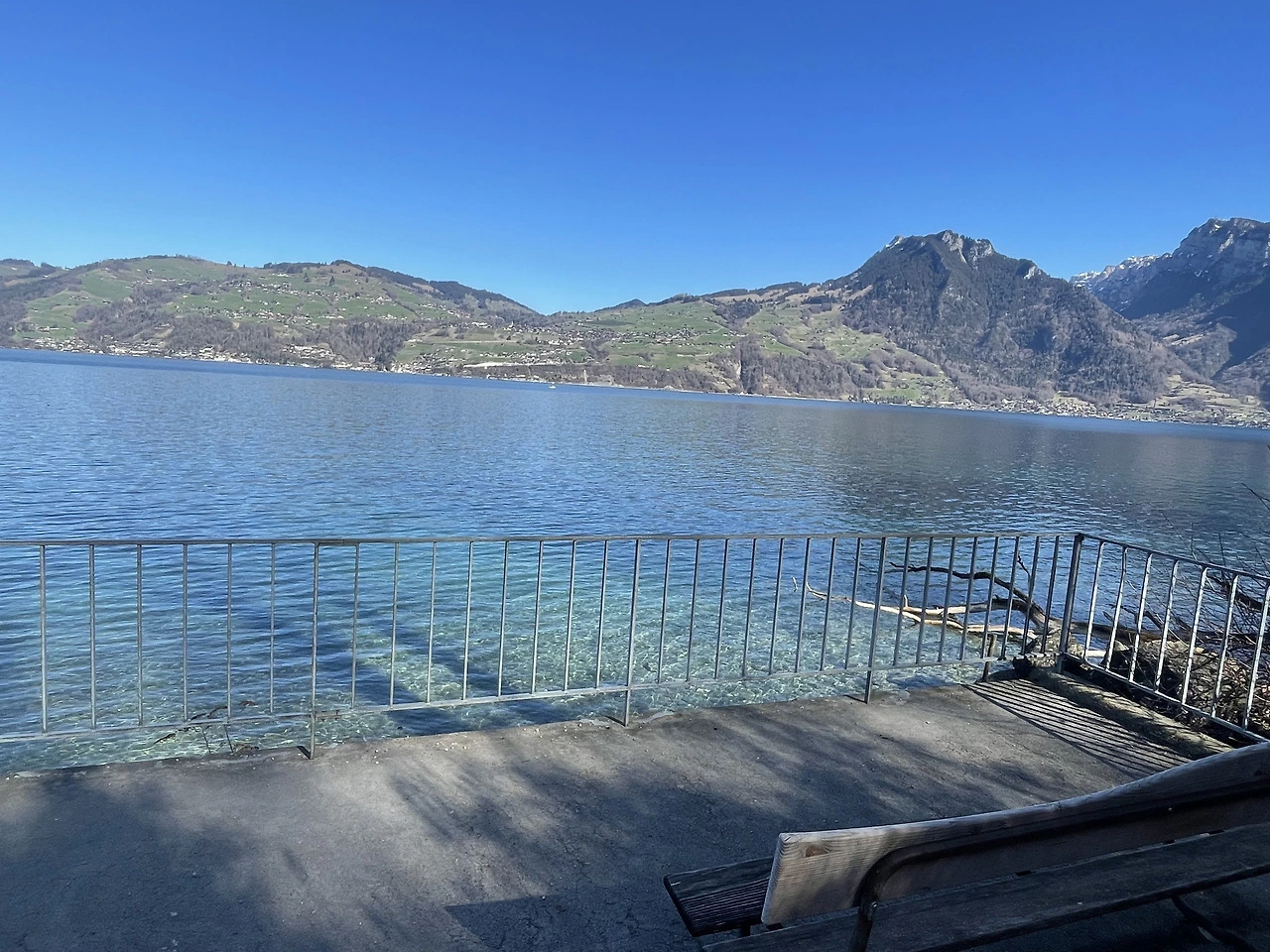 한 커플도 저와 같이 명언을 읽으면서 지나가다가 오른쪽 의자 앞에서 진짜 맞지 않냐며 눈빛을 교환하네요. 저도 진짜 마음에 드는 명언은 두고두고 읽어 보려고 사진을 찍어 왔어요. 호수도 멋지고 알프스 산맥들도 병풍처럼 둘러싸고 있고 나무들도 가지를 쭉 뻗어 산책하는 사람들을 환영하는 느낌이에요.