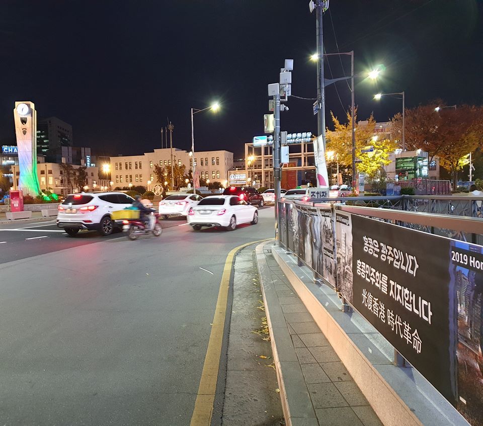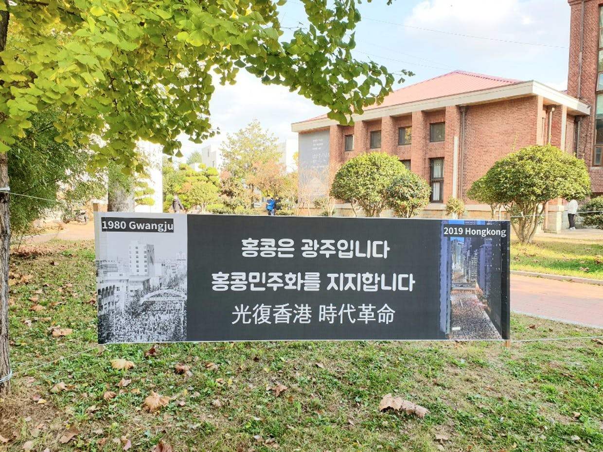 2019년 11월 14일, 5.18민주광장과 전남대학교에 홍콩시위 지지를 표명하는 현수막 4장을 게시했다. 현수막을 게시한 본인으로서 말하자면, 당시에는 별다른 계획을 가지고 있지 않았으며, 홍콩시위 지지를 표명하는 목소리를 내야겠다는 생각이 들어 직접 현수막을 디자인한 후 인쇄업체를 통해 인쇄했다. 총 6장의 현수막을 인쇄한 후 광주청년유니온 정회민 정책팀장과 함께 앞서 언급한 두 곳에 4장을 게시했다. 현수막을 게시한 직후 사진을 촬영하여 SNS에도 공유했다.