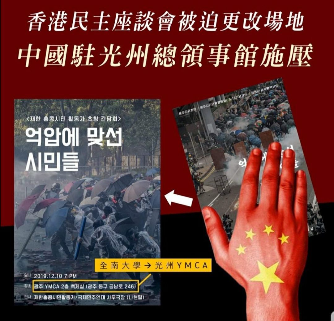 2019년 12월 10일, 전남대학교 이을호 강의실에서 홍콩 활동가 초청 강연회가 진행될 예정이었다. 그러나 중국 총영사 측의 압력으로 학교 측이 대관 취소를 결정했으며, 결국 강연은 광주YMCA에서 진행되었다. 이 과정에서 정병석 전남대 총장이 인문대학 학장에게 "총영사 측 항의가 있었다"는 사실을 전달하고 대관 취소를 지시한 정황이 드러났다. 강연을 주최한 광주인권회의 측은 강연 진행에 앞서 전남대학교와 중국 총영사 측을 규탄하는 기자회견을 진행했다.