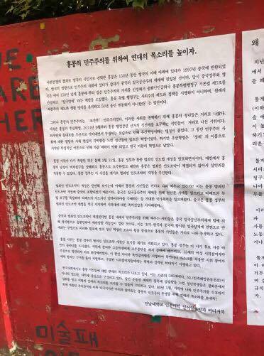 2019년 11월 중순 경, 전국 대학가에 '레논 월(Lennon wall)'과 홍콩 지지 대자보가 확산되기 시작했다. 이에 발맞추어, 2019년 11월 14일 전남대학교에서도 인문대학 재학생이 전남대 인문대 김남주 기념홀 뒤편에 위치한 쪽문에 대자보를 부착했다. 해당 대자보는 '홍콩의 민주주의를 위하여 연대의 목소리를 높이자'라는 제목이었다. 해당 대자보는 하루를 넘기지 못하고 중국인 유학생들에 의해 강제로 철거되었으며, 그 자리에는 '홍콩 폭동의 본질은 테러리즘' 등의 문구가 적힌 종이가 붙었다. 이 역시 같은 날 재학생들에 의해 철거되었다.