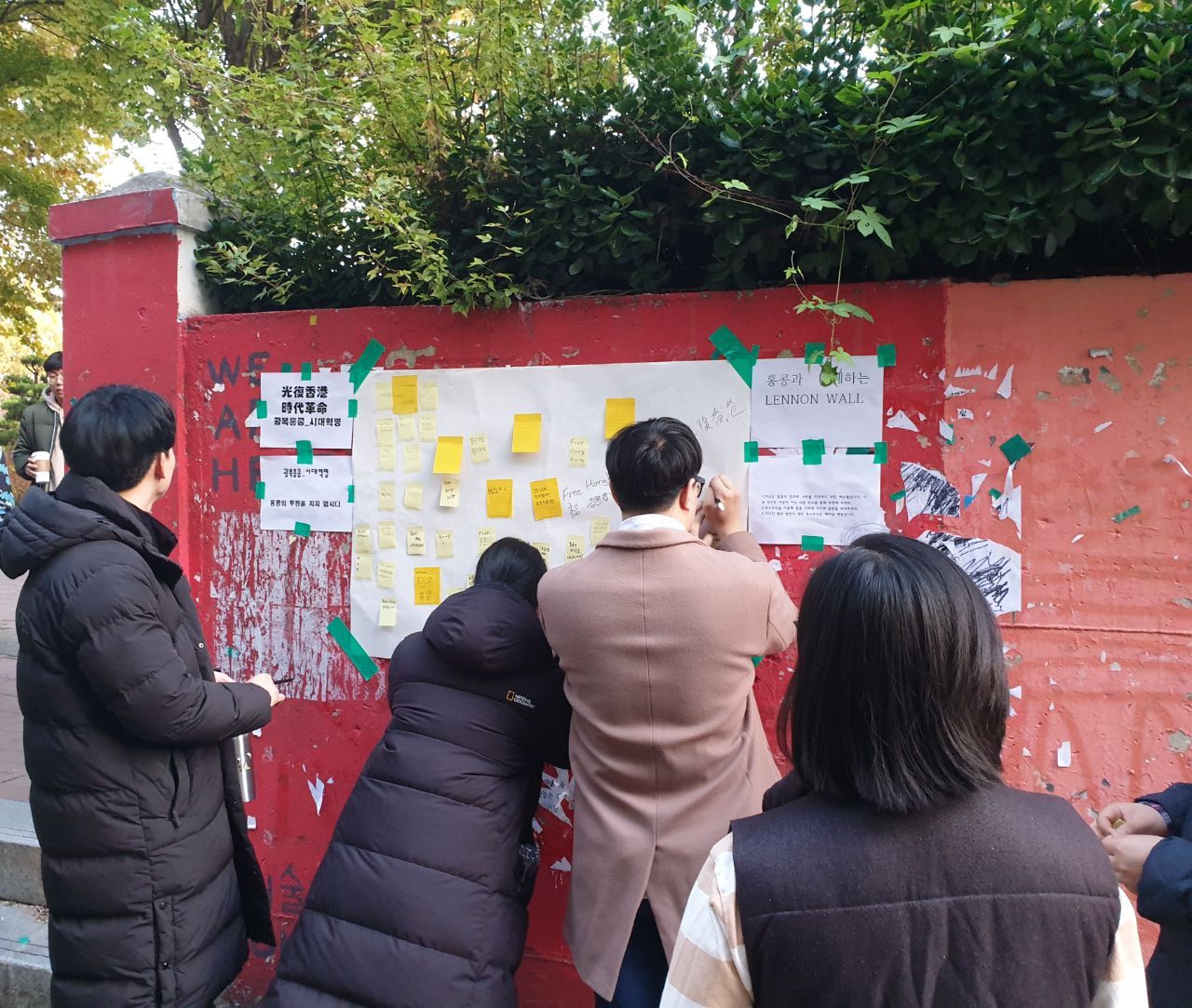 다음날, SNS에 게시된 홍콩시위 지지 현수막 사진을 보고 이재갑에게서 연락이 왔다. 그는 본인을 광주에서 살고 있는 대학생으로 소개한 후 '레논 월'을 설치하고 싶다며 함께할 것을 제안했다. 이에 나는 광주청년유니온의 박형민, 정회민 조합원과 함께 그를 만났다. 우리 네 사람은 전남대 인문대 김남주 기념홀 뒤편에 레논 월을 설치했다. 어제 5.18민주광장 등에 게시한 후 남은 현수막 2장도 함께 게시했다. 이 과정에서 중국인 유학생 20여 명과 충돌이 있었다. 김설, 황법량에게 현장에 와줄 것을 요청했고, 한동안 대치가 이어졌다.