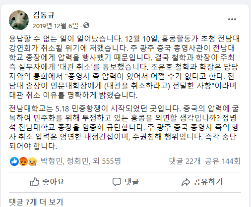 전남대학교 측은 12월 10일로 예정되어 있던 '홍콩활동가 초청 강연회'를 사실상 금지했다. 이 과정에서 전남대학교 정병석 총장이 인문대학 학장에게 "총영사 측 항의가 있었다"는 사실을 전달하고 대관 취소를 지시한 정황이 드러났다. 용납할 수 없는 민주주의 파괴행위였다. 나는 이 사실을 페이스북을 통해 공개했다. 관련 내용을 공개할 창구가 없었기 때문에, 담당자들과 합의해 진행했다.
