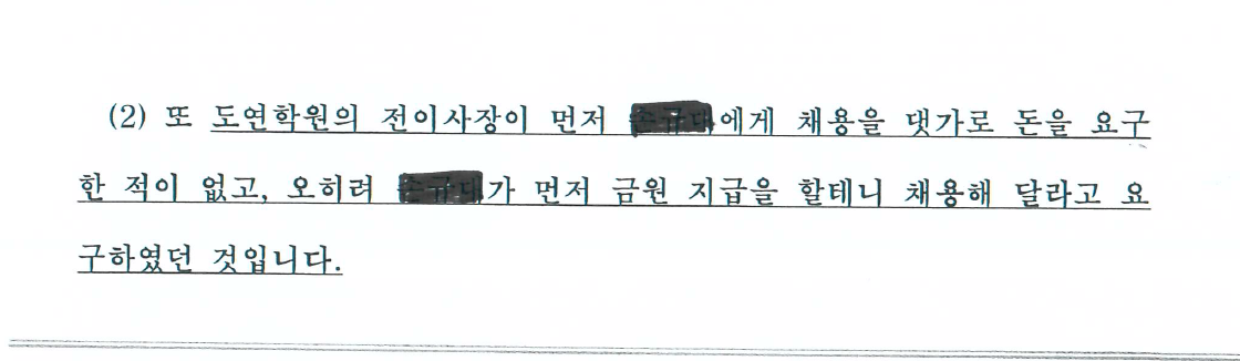 이 판결은 이미 상급법원에서 확정되었다. 그러나, 학교법인 도연학원 측은 이미 확정된 대한민국 사법부의 판단을 정면으로 부정하며 "도연학원 전직 이사장이 먼저 채용을 대가로 돈을 요구한 적이 없다"고 주장하였으며, "A가 먼저 금원 지급을 언급했다"는 명백한 허위의 사실을 '고소장'에 적시하였다.