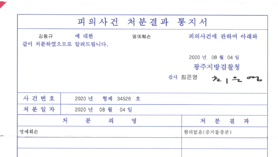 그러나 학교 측이 필자에 대한 2차 고소장을 제출한 직후인 2020년 8월 4일 광주지방검찰청은 김동규에 대한 1차 명예훼손 피의사건을 '혐의 없음(증거 불충분)'으로 종결시켰다.
