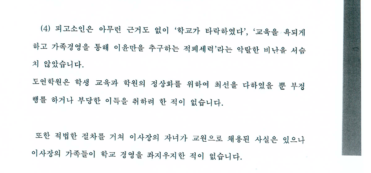 필자는 도연학원을 향해 "재단이 타락했으며, 교육을 욕되게 하고 가족경영을 통해 이윤만을 추구했다"는 비판을 제시했다. 지금까지 학교에서 일어났던 일들을 종합적으로 고려해볼 때, 그동안 쌓여온 폐단들을 검토할 때, '적폐 세력'이라는 비판은 결코 과언이 아니다.