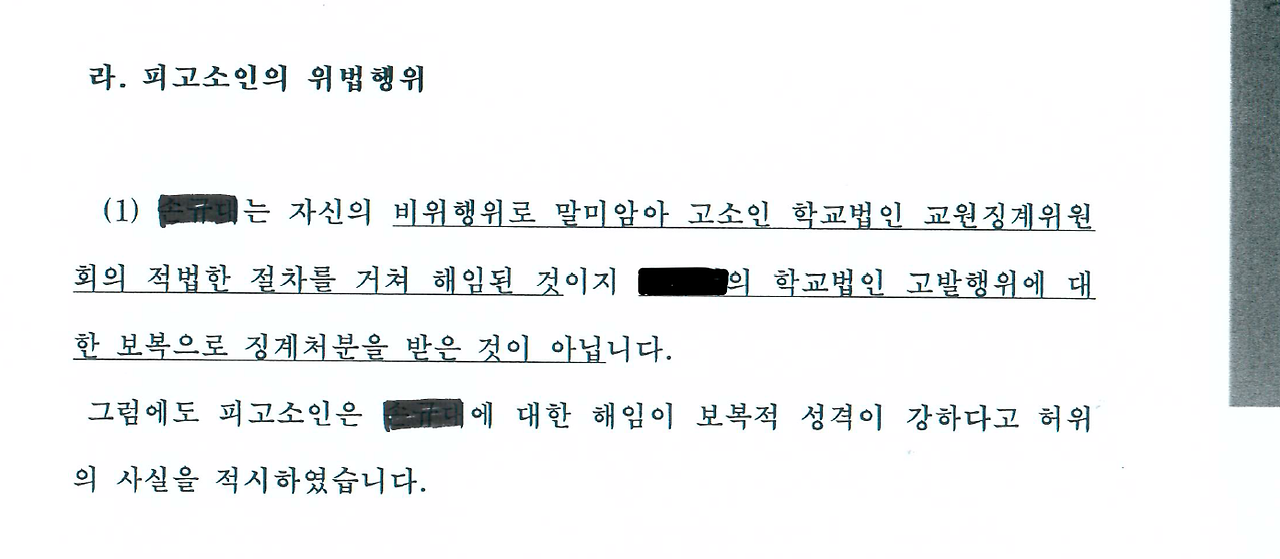 학교 측은 "해임된 A 교사가 자신의 비위행위로 말미암아 학교법인 교원징계위원회의 적법한 절차를 거쳐 해임된 것이지 학교법인 고발 행위에 대한 보복으로 징계처분을 받은 것이 아니다"라고 주장하고 있다.