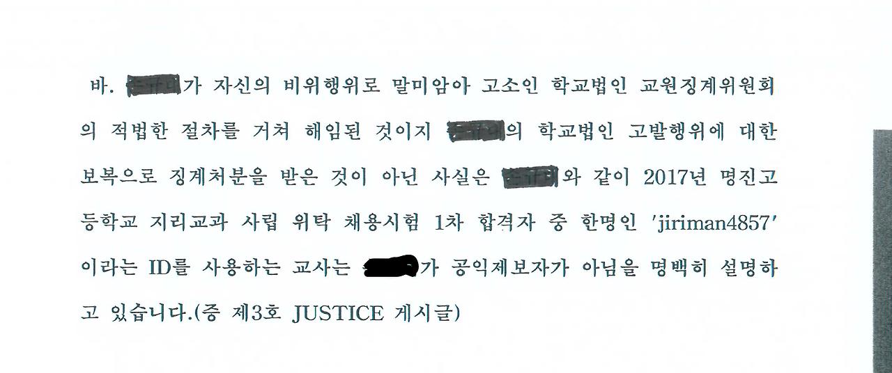 학교 측은 'jiriman4857'이라는 ID를 사용하는 교사의 게시글을 근거로 "해임된 A 교사가 공익제보자가 아님이 명백하다"고 주장했다. 그러나, 사건을 처음부터 끝까지 알고 있지 못하는 이의 주장만을 인용하여 사실관계의 가부를 단언하는 버릇은 좋지 않다. 'jiriman4857'의 관점과 별개로, 교사 A는 이미 국무총리실 산하 국민권익위원회로 부터 '공익제보자'임을 인정받은 바 있다.