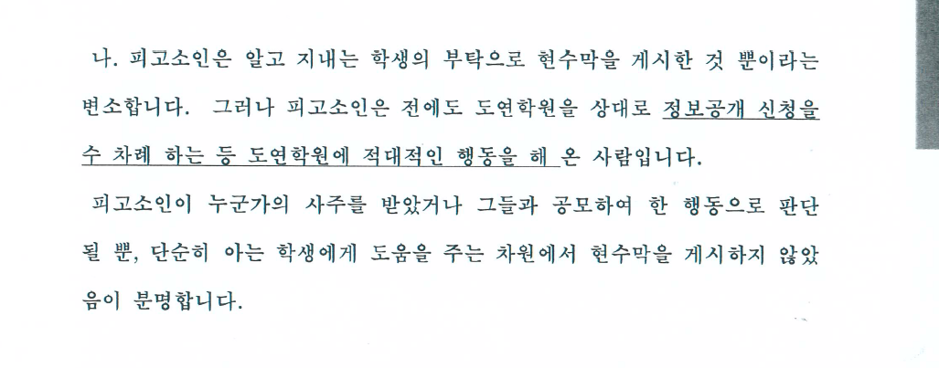 학교 측은 필자가 "학교 측에 정보공개 신청을 수 차례 하는 등 도연학원에 적대적인 행동을 해 온 사람"이라고 주장했다. 그러나 정보공개 청구는 사립학교에게도 '고유업무'에 해당한다. 고유업무의 수행을 요청하는 행동을 '적대적인 행동'으로 해석하는 것은 마치 응급상황을 마주하여 경찰을 부른 사람을 향해 "경찰에 적대적인 행동을 하지 말라"고 비난하는 것과 같다. 실로 황당하기 이를 데 없는 주장이다. 참여연대와 같은 시민단체가 A4 용지 40박스에 해당하는 정보공개를 청구했을 때에도, 법원은 시민단체의 손을 들어주었다.