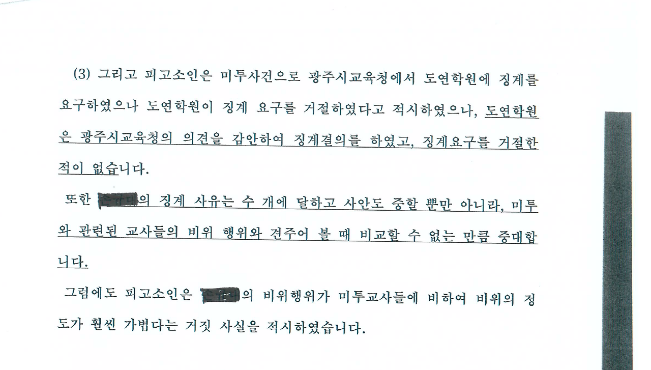 필자는 학교 측이 징계를 하지 않았다고 주장하지는 않았다. 학교 측은 스쿨미투 연루 교사들을 징계했다. 이것은 징계의 최종적인 결정을 학교법인 측에 위임해둔 '사립학교법'에 비추어 볼 때, 명백히 합법적인 행위에 해당한다. 그러나 광주시교육청, 즉 관할 행정청이 요구했던 중징계의 85% 이상이 경징계로 대체된 것으로 미루어 볼 때 그 본질적인 정당성에는 깊은 의문점을 느끼지 않을 수 없다.