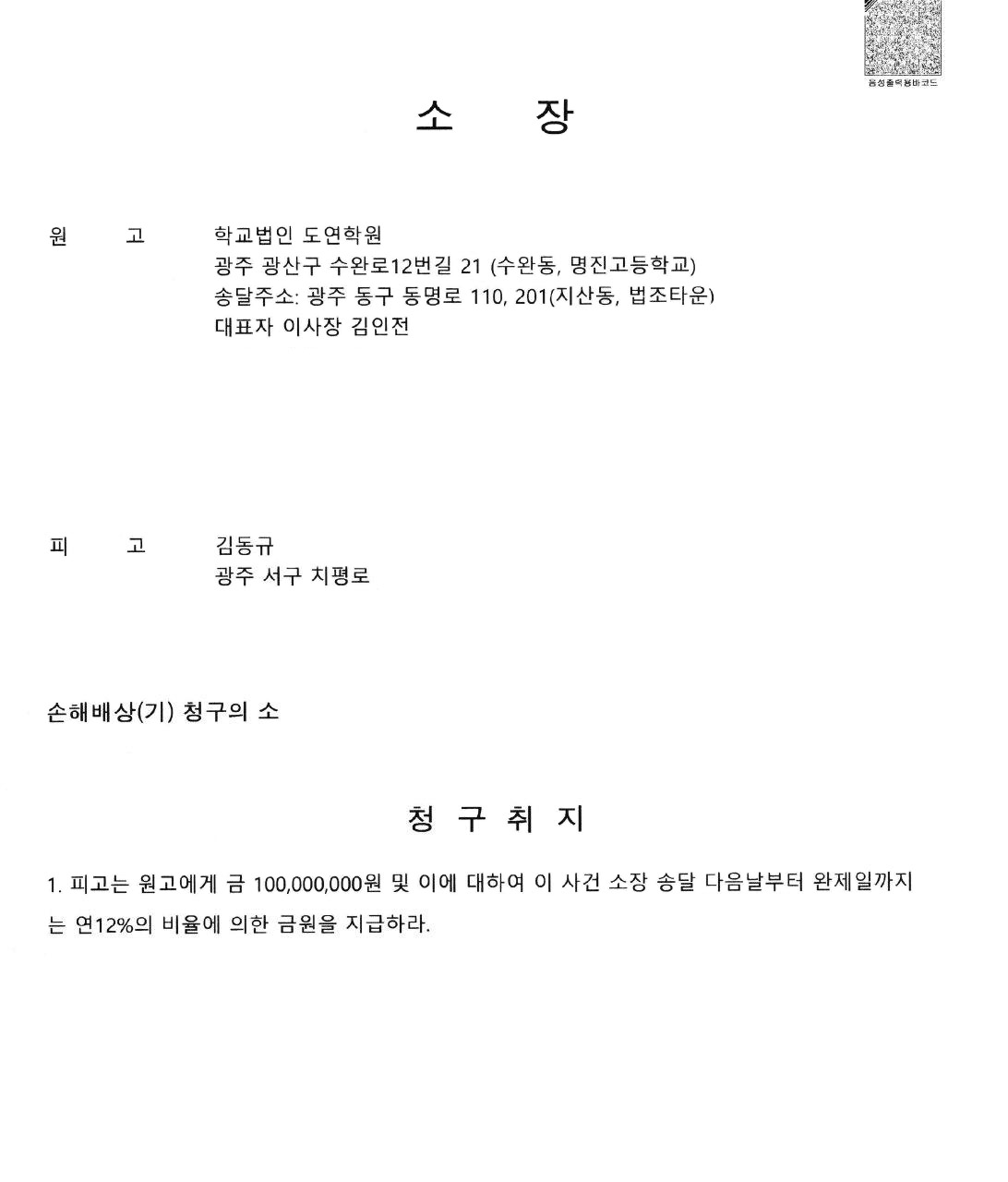 한편, 2020년 8월 31일 필자 앞으로 광주지방법원에서 보낸 특별 송달 우편물이 왔다. 광주 명진고 재단 측이 필자에게 '1억 원'을 요구하는 내용의 민사소송을 제기했다는 내용이 담긴 소장이었다.