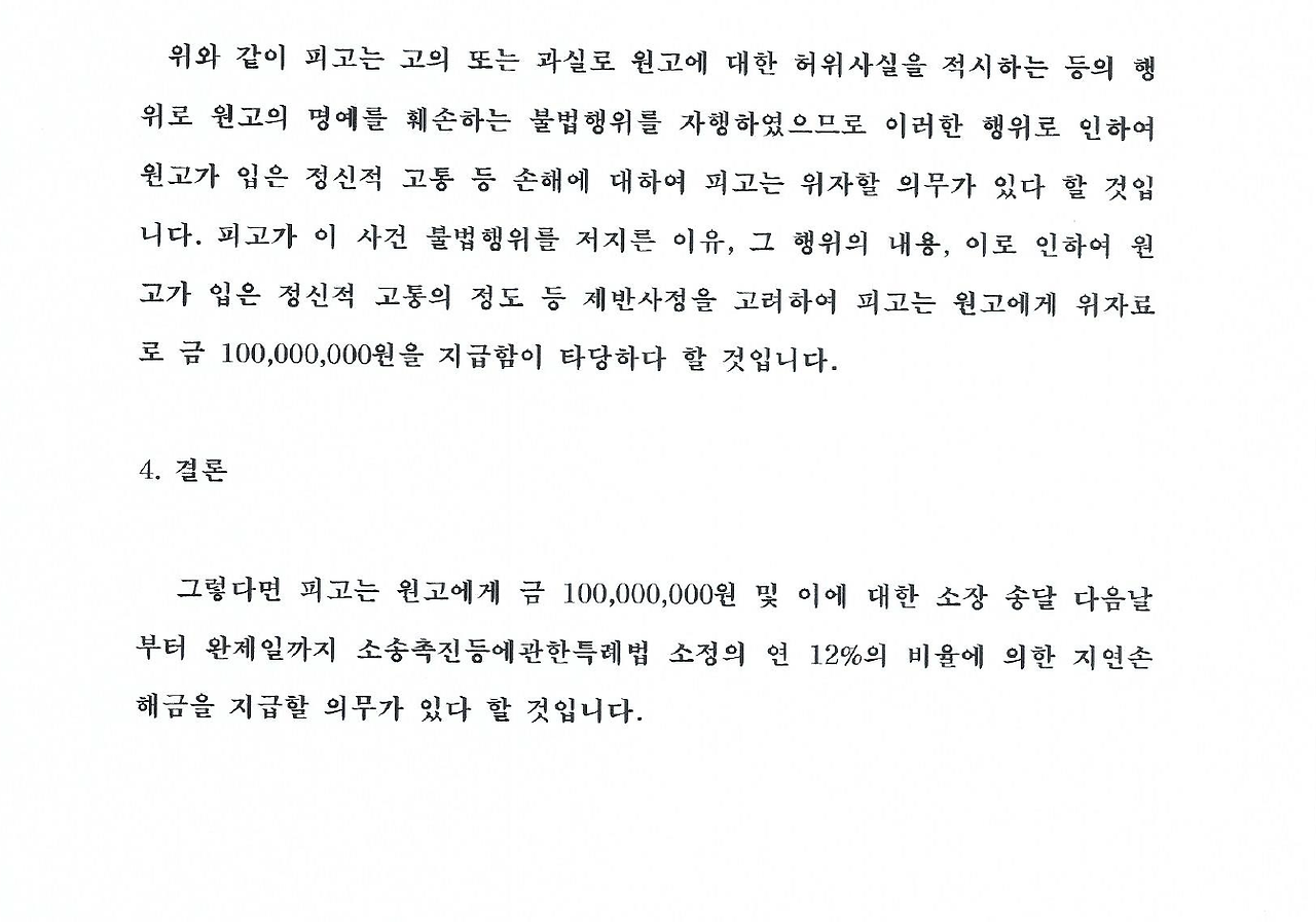 "원고의 이 주장은 이번 민사소송과 전혀 이해관계를 가진 바도 없는 등 아무런 관련도 없는 주장입니다."