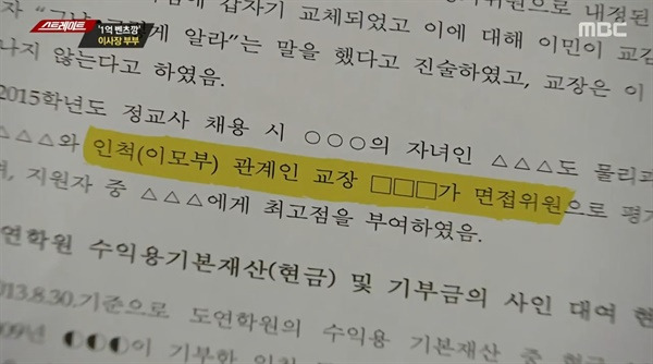 ▲ 명진고 전·현직 이사장 부부의 두 딸 채용에 두 사람의 이모부가 개입되어 다는 내용의 교육청 감사결과 ⓒ MBC 스트레이트