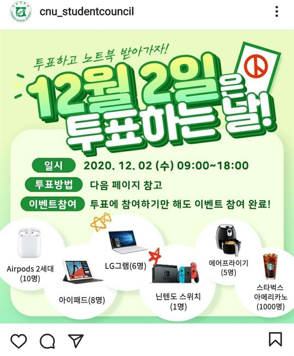 '경품 추천 이벤트' 역시 투표율을 높이기 위해 고안되었다. 이벤트 내용은 단순했다. 투표에 참여한 사람들을 대상으로 추첨을 실시하여 경품(스타벅스 아메리카노 1000잔, 에어팟 2세대 10개, LG 그램 노트북 6대, 닌텐도 스위치 1개, 아이패드 8개)을 나누어주는 것이었다. 경품은 총 1030개로 커피 1천 잔과 고액 경품 30개로 나뉘었다.