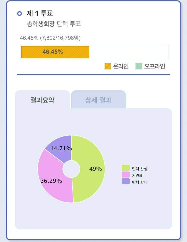 그러나 투표에 참여한 7,802명 중 49%가 탄핵 찬성에 투표하여 사실상 학생들의 압도적인 탄핵 찬성 여론은 확인되었다. 탄핵 반대는 14.71%에 불과했다.