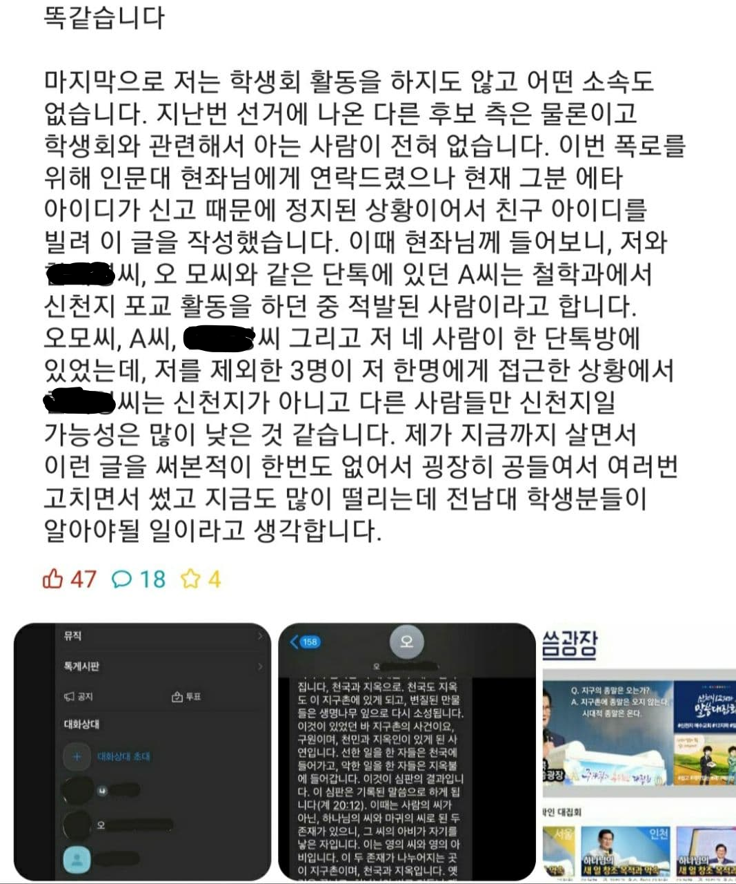 그러나, 1월 30일, 전남대 익명 커뮤니티 에브리타임에 올라온 한 편의 글이 모든 상황을 바꿨다.