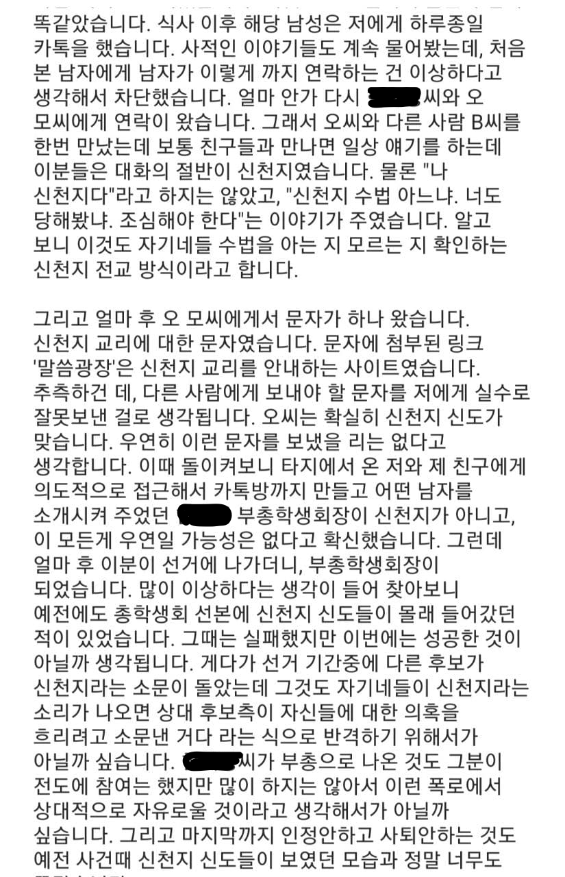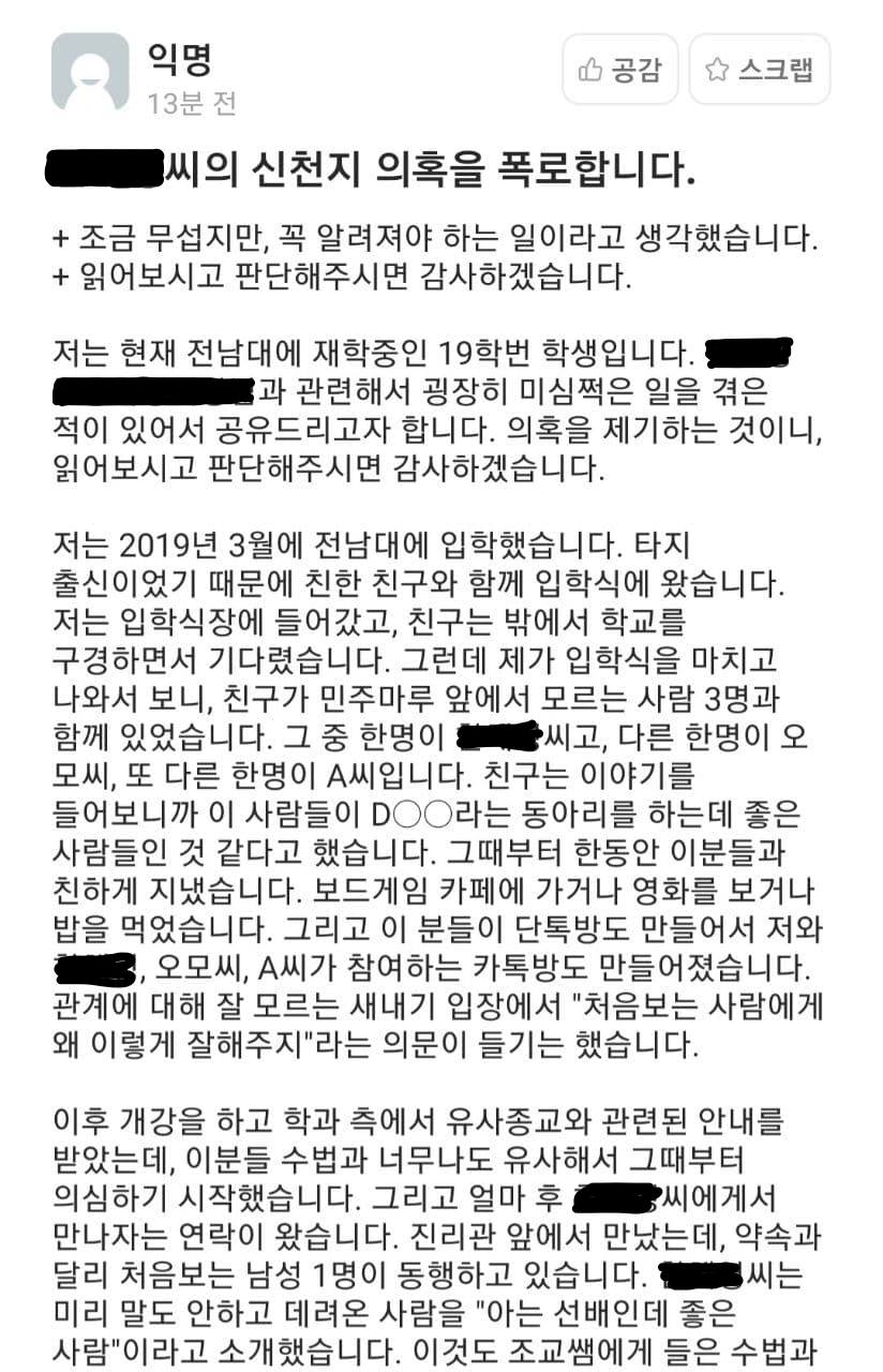 2021년 1월 30일, 스스로를 전남대 19학번으로 밝힌 B씨가 현직 전남대 총학생회 간부 C가 사이비 종교 신천지 소속일 가능성이 있음을 폭로했다. B는 입학식 날 C, D, E 일행을 만난 이후 그들과 자주 어울렸다. 세 사람은 'DOO'라는 임의 동아리 소속이었다. 그러나 훗날 B는 D가 신천지 부장급 인사이고 E 역시 전남대 인문대학에서 포교를 시도하던 중 발각된 전력이 있다는 사실을 알게 되었다. B와 C가 식사 약속을 한 자리에 C가 사전 동의를 얻지 않고 F를 데려온 일도 있었다. '3:1 관계망 형성', '우연을 가장한 만남' 등은 모두 신천지 전도 수법과 정확히 일치된다.