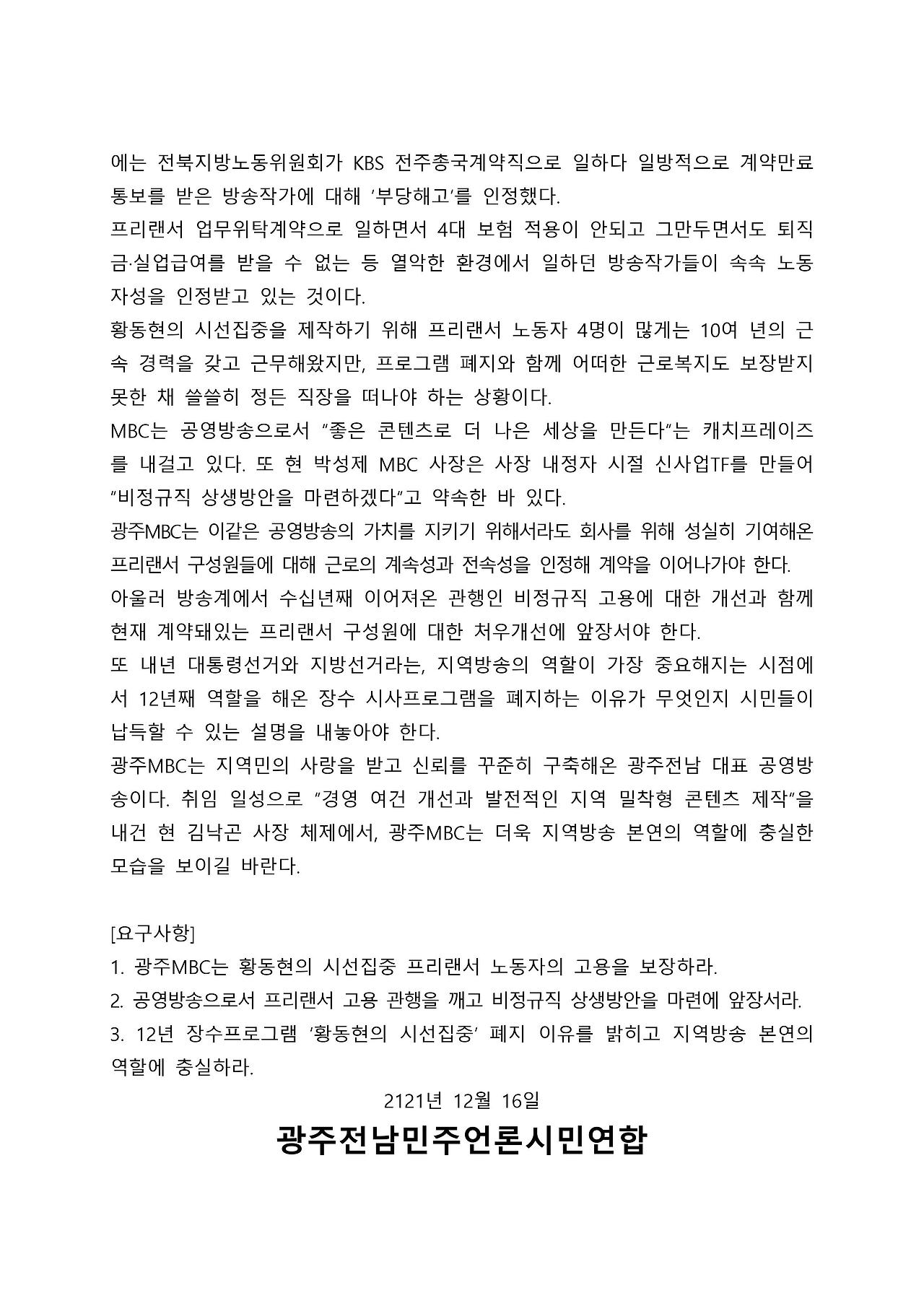 또 "2021년, 공정을 외치는 지역 언론에서, 무엇보다 민주, 인권, 평화의 도시를 자처하는 광주에서 50여 년 전 전태일 열사를 만든 일이 일어났다"며 "그동안 <황동현의 시선집중>이 프리랜서, 비정규직 노동자들의 처우 문제를 심층적으로 다뤄왔는데, 이때 다뤘던 열악한 노동구조는 또한 방송을 만들던 저희들 '안'에도 있었다"고 강조했다.