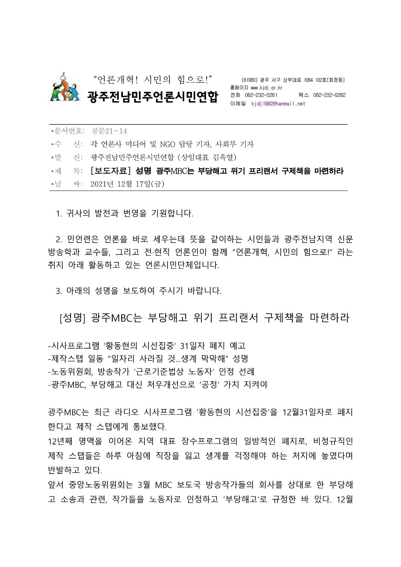 12월 17일 광주MBC가 <황동현의 시선집중> 폐지와 관련해 입장문을 발표했다. 이후 해당 입장문은 언론에 배포되었고, 광주드림이 입장문 내용 반영한 기사를 냈다.