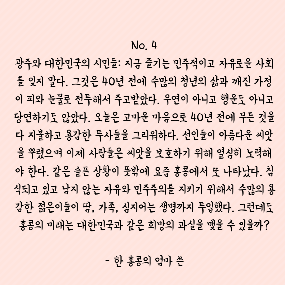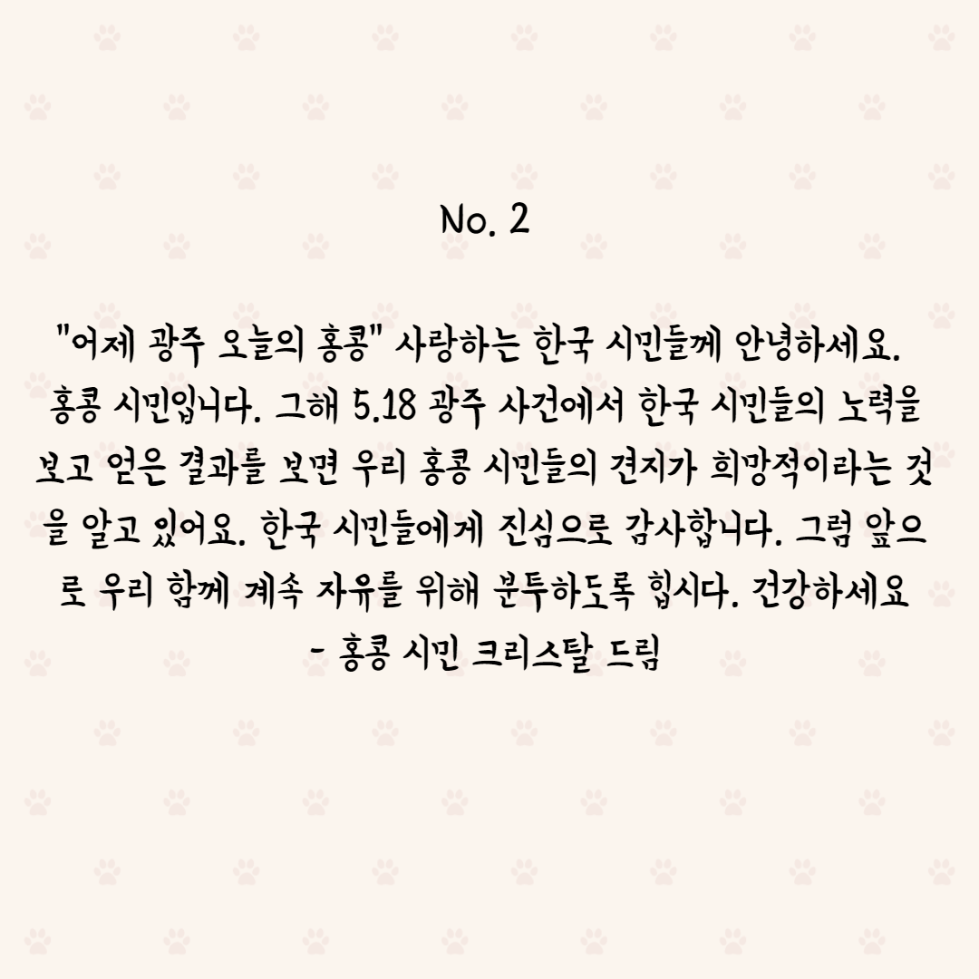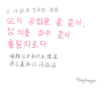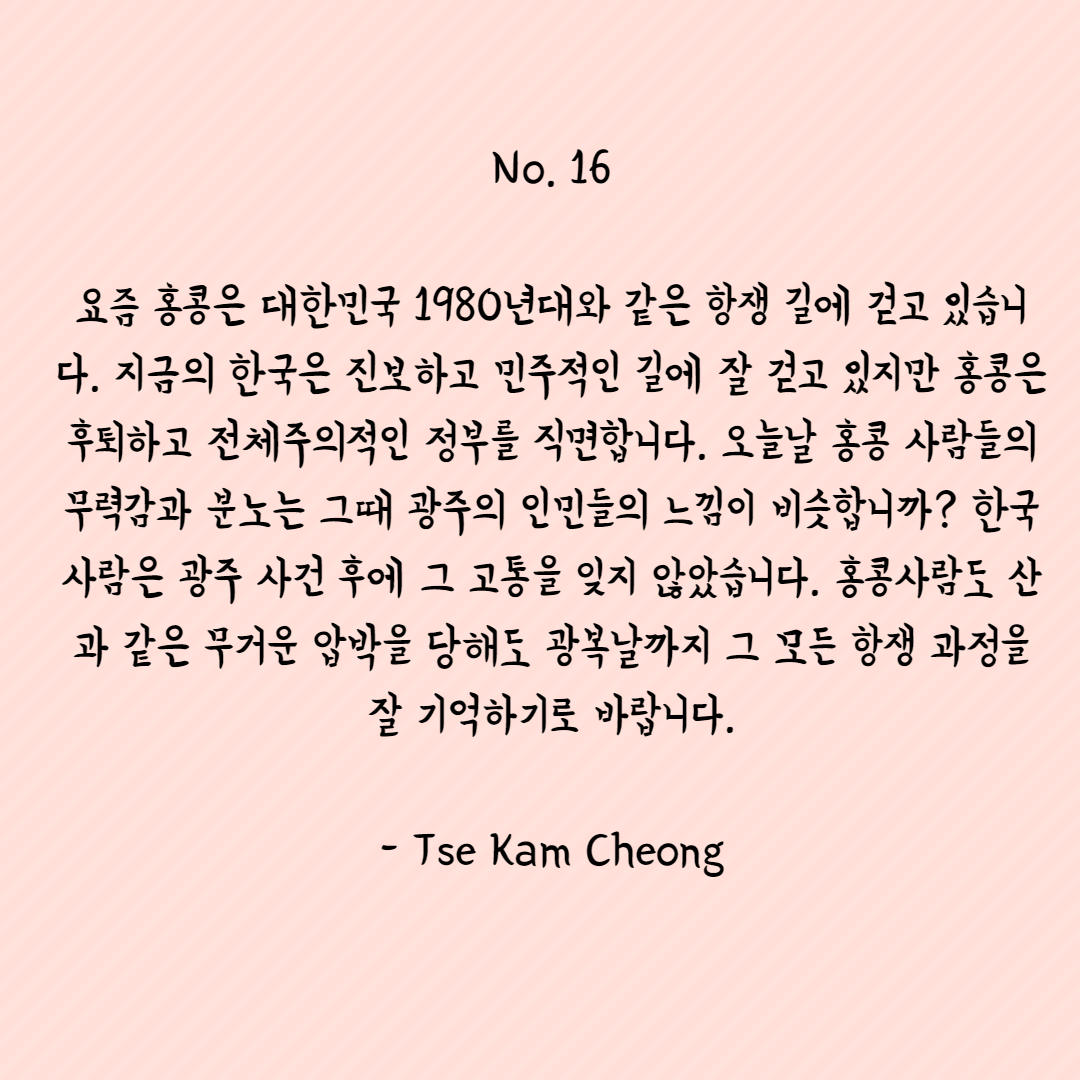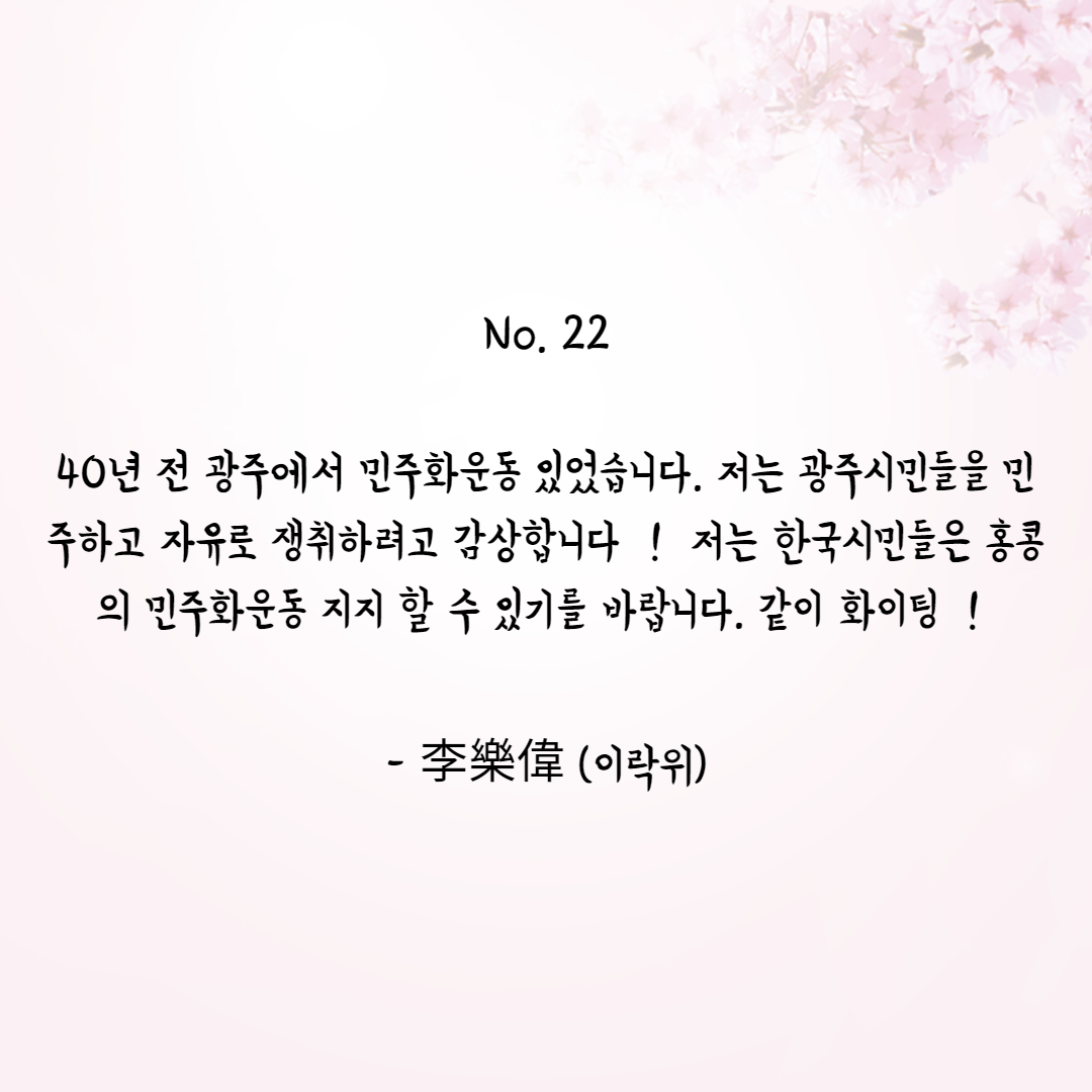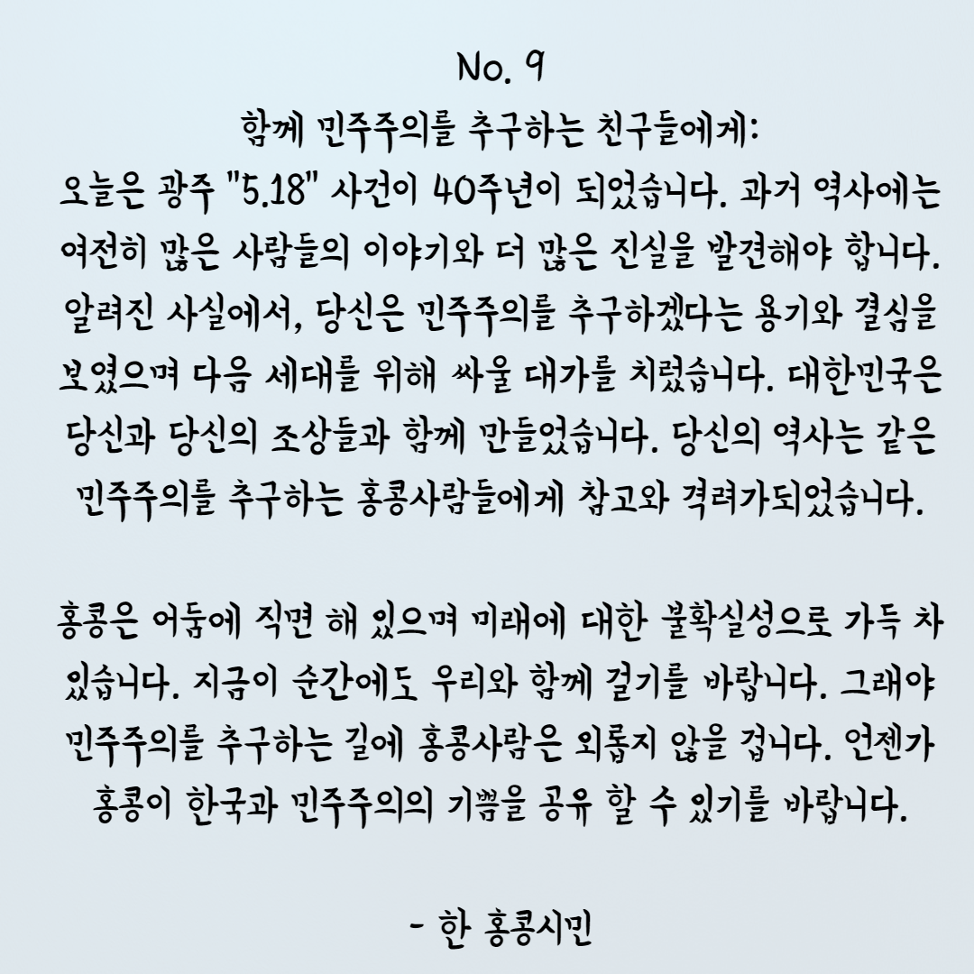 "어제 광주 오늘의 홍콩" 사랑하는 한국 시민들께 안녕하세요. 홍콩 시민입니다. 그해 5.18 광주 사건에서 한국 시민들의 노력을 보고 얻은 결과를 보면 우리 홍콩 시민들의 견지가 희망적이라는 것을 알고 있어요. 한국 시민들에게 진심으로 감사합니다. 그럼 앞으로 우리 함께 계속 자유를 위해 분투하도록 힙시다. 건강하세요