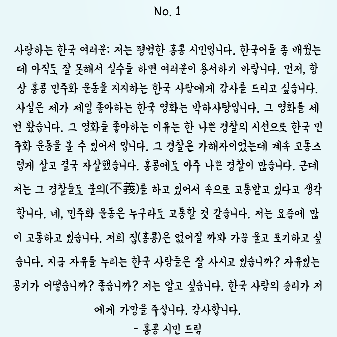사랑하는 한국 여러분: 저는 평범한 홍콩 시민입니다. 한국어를 좀 배웠는데 아직도 잘 못해서 실수를 하면 여러분이 용서하기 바랍니다. 먼저, 항상 홍콩 민주화 운동을 지지하는 한국 사람에게 감사를 드리고 싶습니다. 사실은 제가 제일 좋아하는 한국 영화는 박하사탕입니다. 그 영화를 세 번 봤습니다. 그 영화를 좋아하는 이유는 한 나쁜 경찰의 시선으로 한국 민주화 운동을 볼 수 있어서 입니다. 그 경찰은 가해자이었는데 계속 고통스럽게 살고 결국 자살했습니다. 홍콩에도 아주 나쁜 경찰이 많습니다. 근데 저는 그 경찰들도 불의(不義)를 하고 있어서 속으로 고통받고 있다고 생각합니다. 네, 민주화 운동은 누구라도 고통할 것 같습니다. 저는 요즘에 많이 고통하고 있습니다. 저희 집(홍콩)은 없어질 까봐 가끔 울고 포기하고 싶습니다. 지금 자유를 누리는 한국 사람들은 잘 사시고 있습니까? 자유있는 공기가 어떻습니까? 좋습니까? 저는 알고 싶습니다. 한국 사람의 승리가 저에게 가망을 주십니다. 감사합니다.